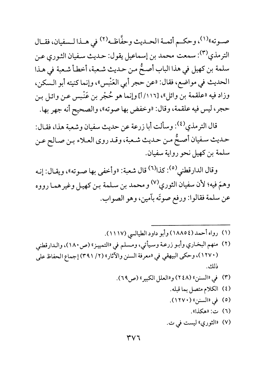 صوته» (¬١)، وحكم أئمة الحديث وحفَّاظه (¬٢) في هذا لسفيان، فقال الترمذي (¬٣): سمعت محمد بن إسماعيل يقول: حديث سفيان الثوري عن سلمة بن كهيل في هذا الباب أصحُّ من حديث شعبة، أخطأ شعبة في هذا الحديث في مواضع، فقال: «عن حجر أبي العَنْبس»، وإنما كنيته أبو السكن، وزاد فيه «علقمة بن وائل»، [١١٦/أ] وإنما هو حُجْر بن عَنْبس عن وائل بن حجر، ليس فيه علقمة، وقال: «وخفض بها صوته»، والصحيح أنه جهر بها.