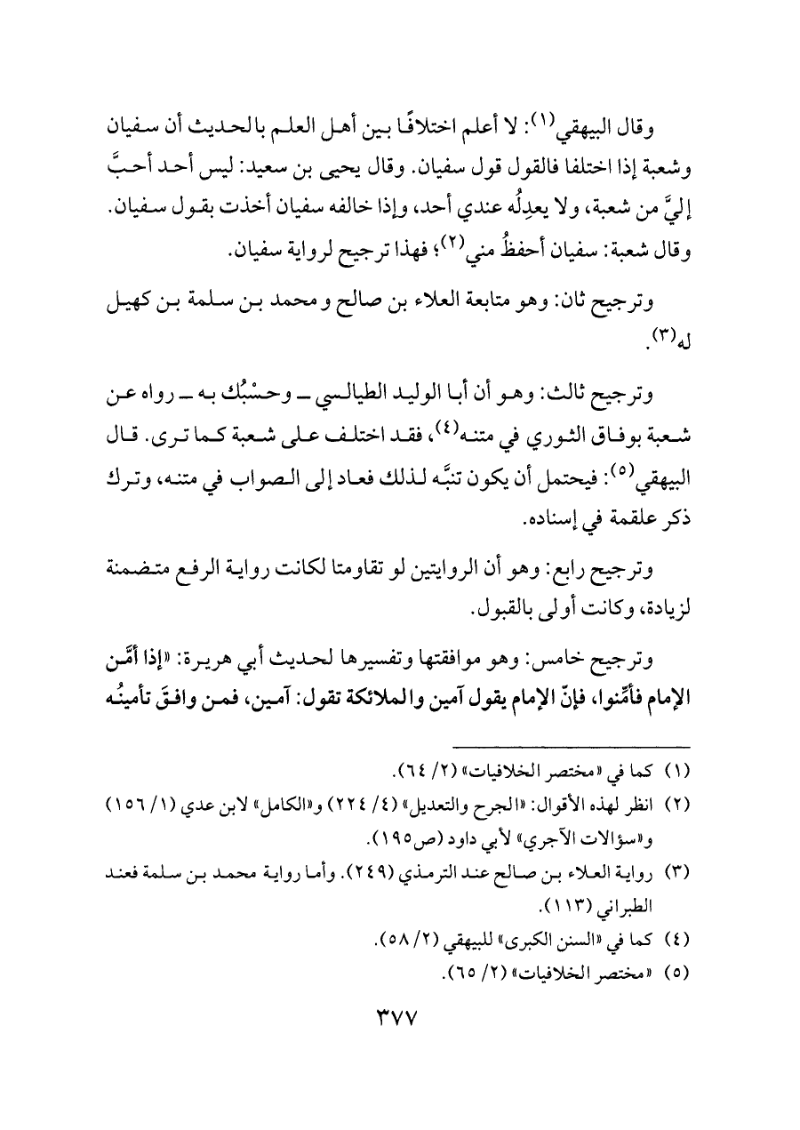 وقال البيهقي (¬١): لا أعلم اختلافًا بين أهل العلم بالحديث أن سفيان وشعبة إذا اختلفا فالقول قول سفيان. وقال يحيى بن سعيد: ليس أحد أحبَّ إليَّ من شعبة، ولا يعدِلُه عندي أحد، وإذا خالفه سفيان أخذت بقول سفيان. وقال شعبة: سفيان أحفظُ مني (¬٢)؛ فهذا ترجيح لرواية سفيان.