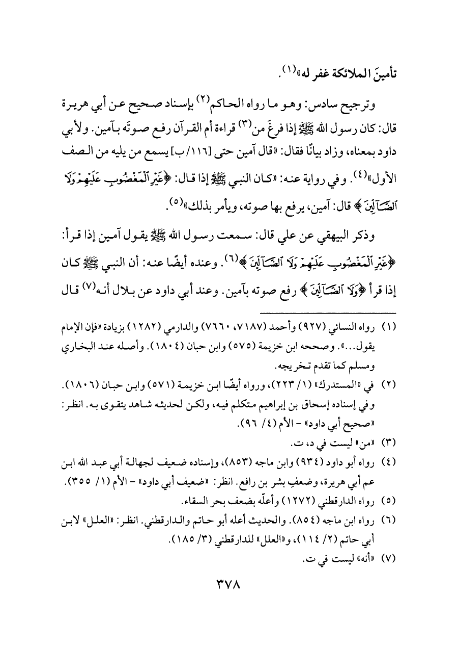 وترجيح سادس: وهو ما رواه الحاكم (¬٢) بإسناد صحيح عن أبي هريرة قال: كان رسول الله - صلى الله عليه وسلم - إذا فرغَ من (¬٣) قراءة أم القرآن رفع صوتَه بآمين. ولأبي داود بمعناه، وزاد بيانًا فقال: «قال آمين حتى [١١٦/ب] يسمع من يليه من الصف الأول» (¬٤). وفي رواية عنه: «كان النبي - صلى الله عليه وسلم - إذا قال: {غَيْرِ الْمَغْضُوبِ عَلَيْهِمْ وَلَا الضَّالِّينَ} قال: آمين، يرفع بها صوته، ويأمر بذلك» (¬٥).