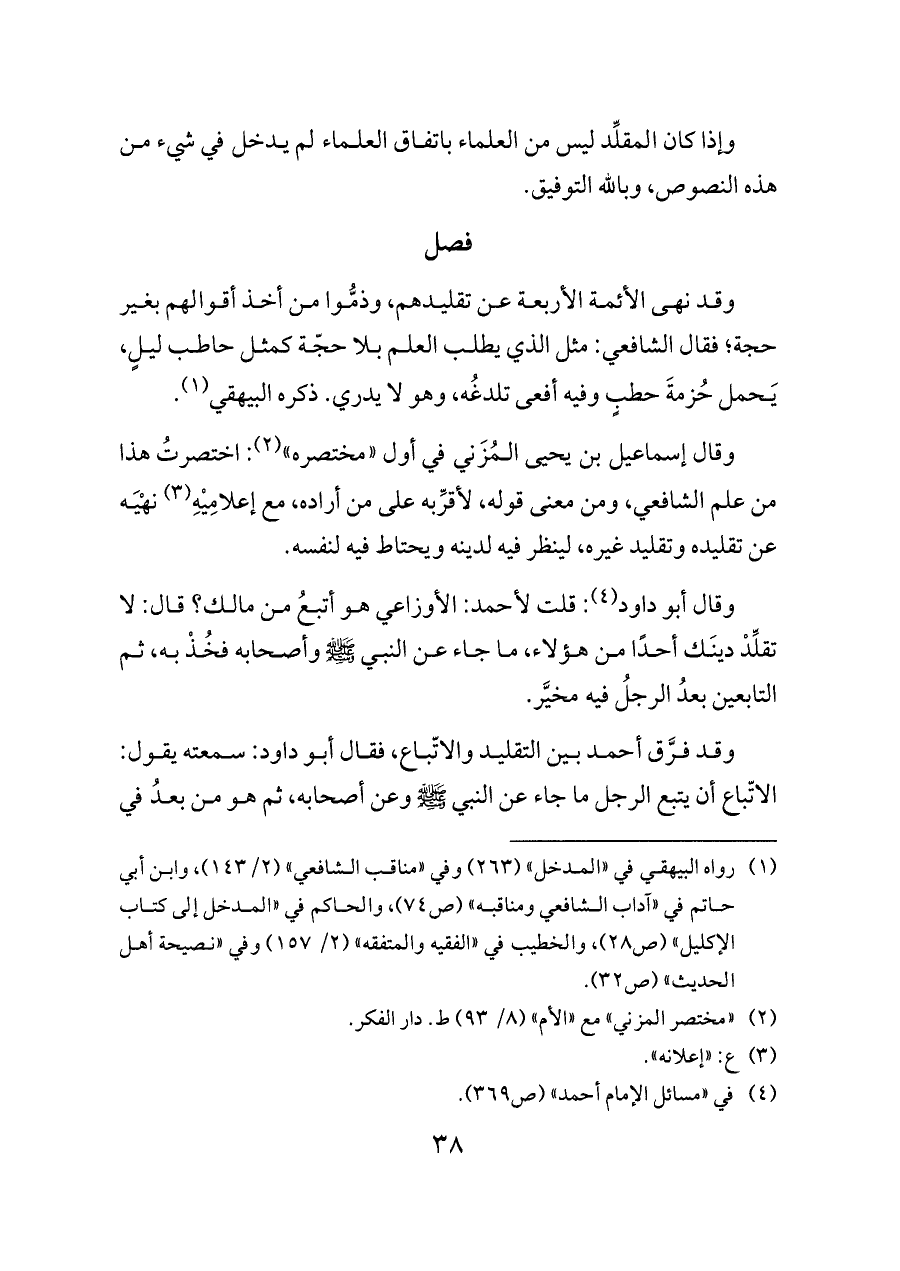 وقد نهى الأئمة الأربعة عن تقليدهم، وذمُّوا من أخذ أقوالهم بغير حجة؛ فقال الشافعي: مثل الذي يطلب العلم بلا حجّة كمثل حاطب ليلٍ، يَحمل حُزمةَ حطبٍ وفيه أفعى تلدغُه، وهو لا يدري. ذكره البيهقي (¬١).