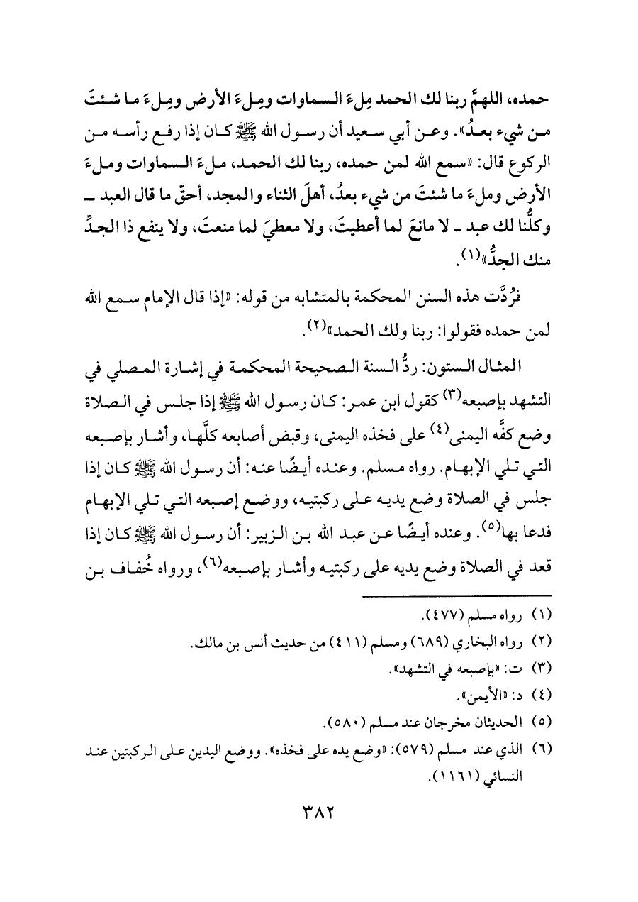 المثال الستون: ردُّ السنة الصحيحة المحكمة في إشارة المصلي في التشهد بإصبعه (¬٣) كقول ابن عمر: كان رسول الله - صلى الله عليه وسلم - إذا جلس في الصلاة وضع كفَّه اليمنى (¬٤) على فخذه اليمنى، وقبض أصابعه كلَّها، وأشار بإصبعه التي تلي الإبهام. رواه مسلم. وعنده أيضًا عنه: أن رسول الله - صلى الله عليه وسلم - كان إذا جلس في الصلاة وضع يديه على ركبتيه، ووضع إصبعه التي تلي الإبهام فدعا بها (¬٥). وعنده أيضًا عن عبد الله بن الزبير: أن رسول الله - صلى الله عليه وسلم - كان إذا قعد في الصلاة وضع يديه على ركبتيه وأشار بإصبعه (¬٦)، ورواه خُفاف بن
