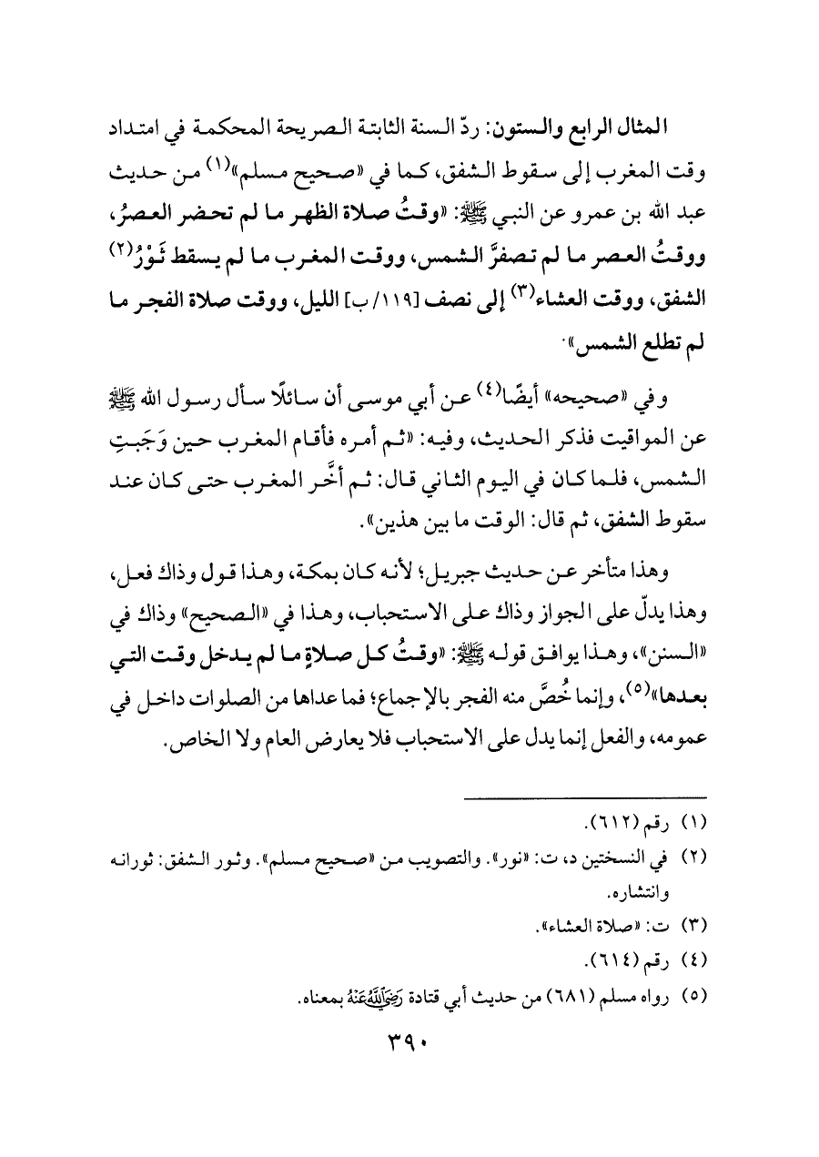 المثال الرابع والستون: ردّ السنة الثابتة الصريحة المحكمة في امتداد وقت المغرب إلى سقوط الشفق، كما في «صحيح مسلم» (¬١) من حديث عبد الله بن عمرو عن النبي - صلى الله عليه وسلم -: «وقتُ صلاة الظهر ما لم تحضر العصرُ، ووقتُ العصر ما لم تصفرَّ الشمس، ووقت المغرب ما لم يسقط ثَوْرُ (¬٢) الشفق، ووقت العشاء (¬٣) إلى نصف [١١٩/ب] الليل، ووقت صلاة الفجر ما لم تطلع الشمس».