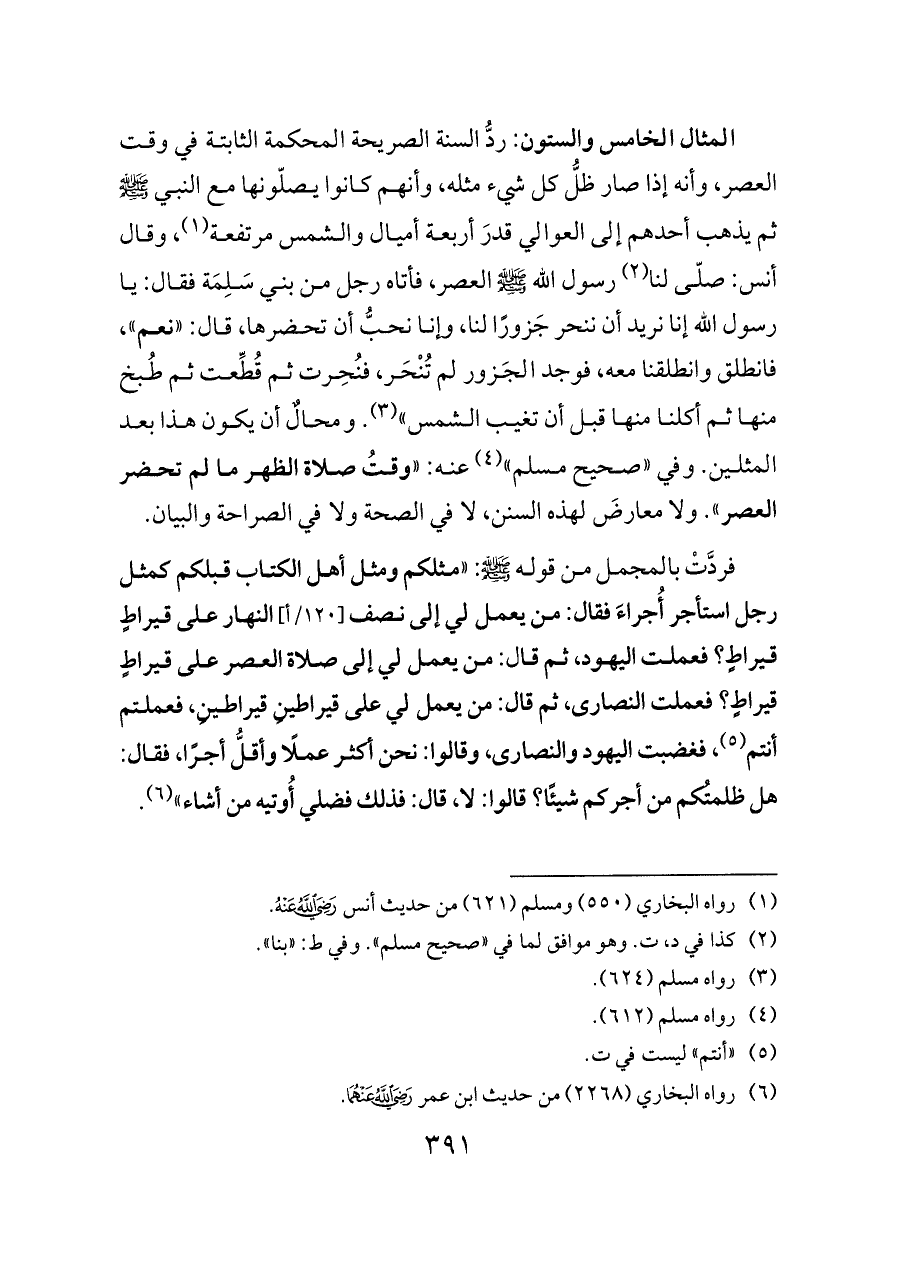 المثال الخامس والستون: ردُّ السنة الصريحة المحكمة الثابتة في وقت العصر، وأنه إذا صار ظلُّ كل شيء مثله، وأنهم كانوا يصلّونها مع النبي - صلى الله عليه وسلم - ثم يذهب أحدهم إلى العوالي قدرَ أربعة أميال والشمس مرتفعة (¬١)، وقال أنس: صلّى لنا (¬٢) رسول الله - صلى الله عليه وسلم - العصر، فأتاه رجل من بني سَلِمَة فقال: يا رسول الله إنا نريد أن ننحر جَزورًا لنا، وإنا نحبُّ أن تحضرها، قال: «نعم»، فانطلق وانطلقنا معه، فوجد الجَزور لم تُنْحَر، فنُحِرت ثم قُطِّعت ثم طُبخ منها ثم أكلنا منها قبل أن تغيب الشمس» (¬٣). ومحالٌ أن يكون هذا بعد المثلين. وفي «صحيح مسلم» (¬٤) عنه: «وقتُ صلاة الظهر ما لم تحضر العصر». ولا معارضَ لهذه السنن، لا في الصحة ولا في الصراحة والبيان.