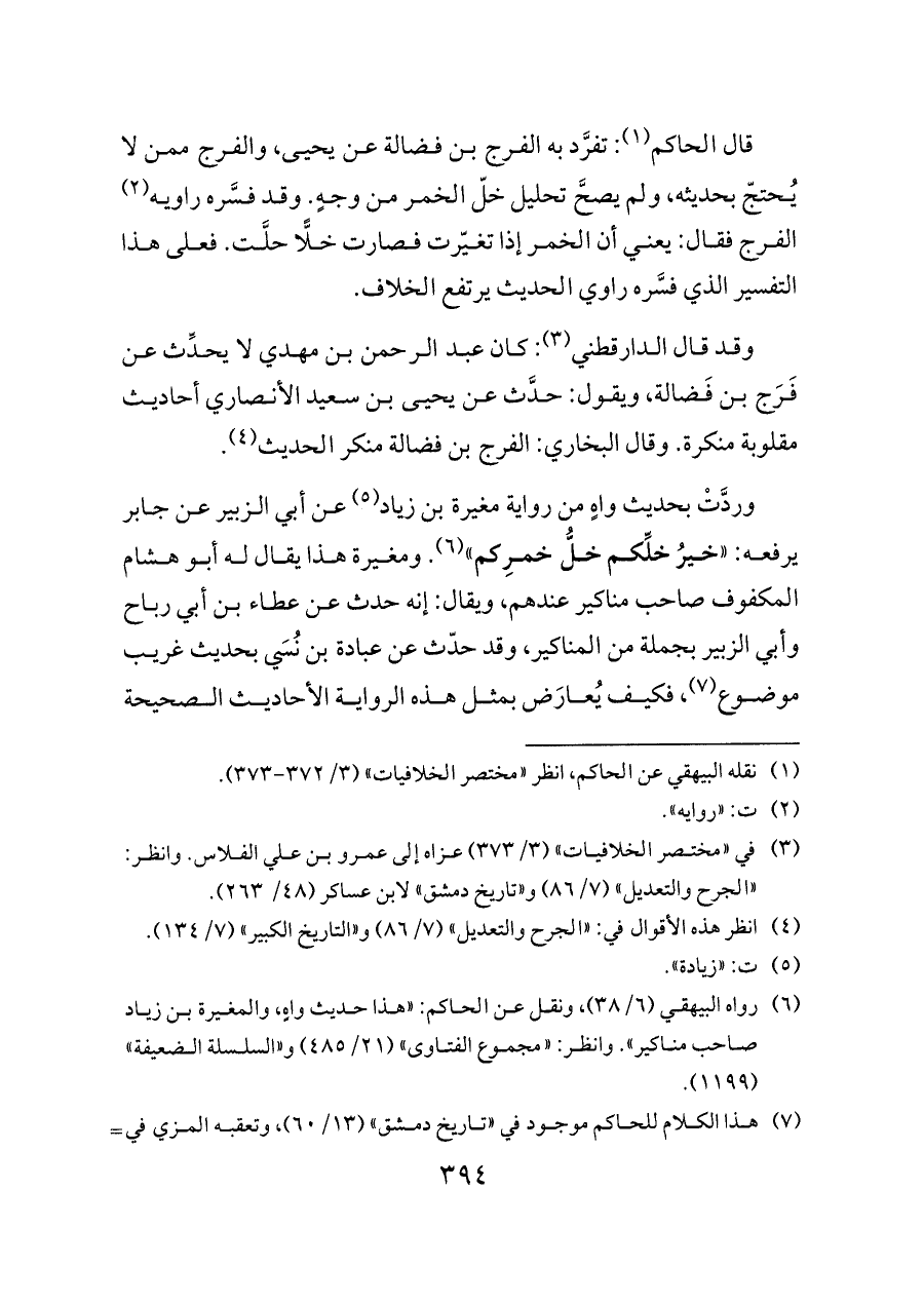 قال الحاكم (¬١): تفرَّد به الفرج بن فضالة عن يحيى، والفرج ممن لا يُحتجّ بحديثه، ولم يصحَّ تحليل خلّ الخمر من وجهٍ. وقد فسَّره راويه (¬٢) الفرج فقال: يعني أن الخمر إذا تغيّرت فصارت خلًّا حلَّت. فعلى هذا التفسير الذي فسَّره راوي الحديث يرتفع الخلاف.