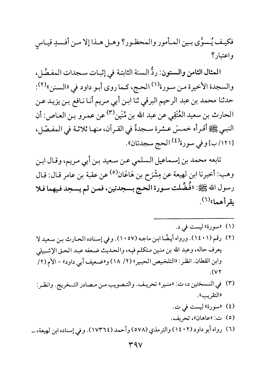 المثال الثامن والستون: ردُّ السنة الثابتة في إثبات سجدات المفصَّل، والسجدة الأخيرة من سورة (¬١) الحج، كما روى أبو داود في «السنن» (¬٢): حدثنا محمد بن عبد الرحيم البرقي ثنا ابن أبي مريم أنا نافع بن يزيد عن الحارث بن سعيد العُتَقِي عن عبد الله بن مُنَين (¬٣) عن عمرو بن العاص: أن النبي - صلى الله عليه وسلم - أقرأه خمسَ عشرة سجدةً في القرآن، منها ثلاثة في المفصّل، [١٢١/ب] وفي سورة (¬٤) الحج سجدتان».