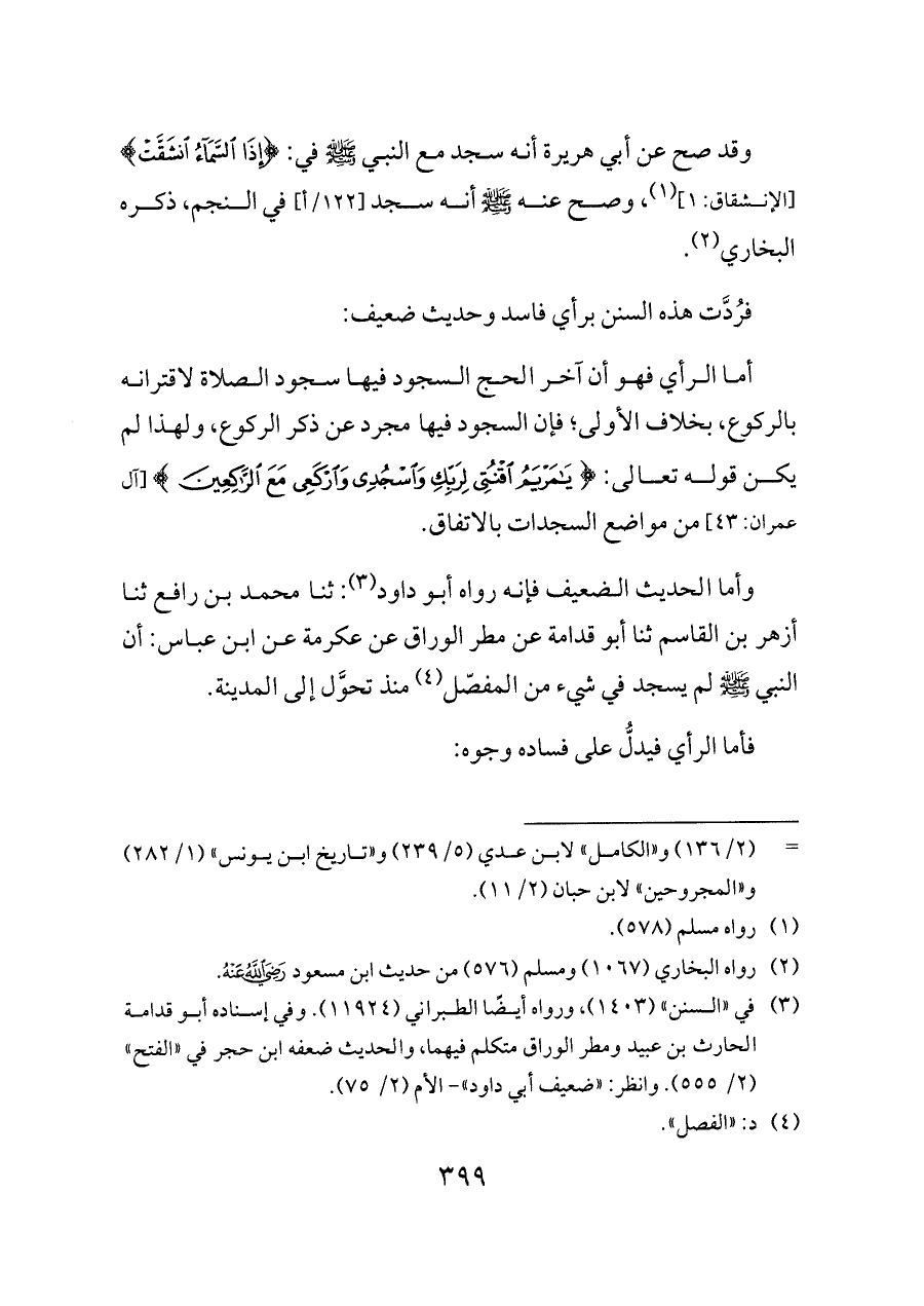 وأما الحديث الضعيف فإنه رواه أبو داود (¬٣): ثنا محمد بن رافع ثنا أزهر بن القاسم ثنا أبو قدامة عن مطر الوراق عن عكرمة عن ابن عباس: أن النبي - صلى الله عليه وسلم - لم يسجد في شيء من المفصّل (¬٤) منذ تحوَّل إلى المدينة.