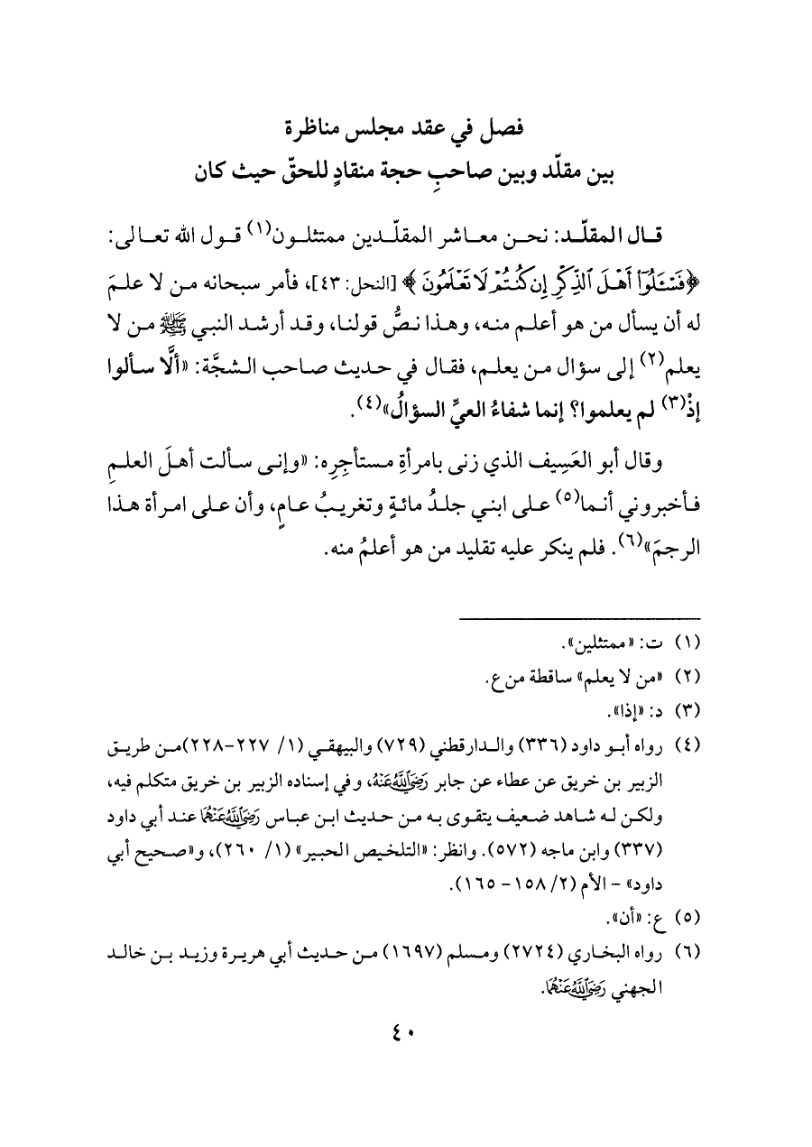 قال المقلّد: نحن معاشر المقلّدين ممتثلون (¬١) قول الله تعالى: {فَاسْأَلُوا أَهْلَ الذِّكْرِ إِنْ كُنْتُمْ لَا تَعْلَمُونَ} [النحل: ٤٣]، فأمر سبحانه من لا علمَ له أن يسأل من هو أعلم منه، وهذا نصُّ قولنا، وقد أرشد النبي - صلى الله عليه وسلم - من لا يعلم (¬٢) إلى سؤال من يعلم، فقال في حديث صاحب الشجَّة: «ألَّا سألوا إذْ (¬٣) لم يعلموا؟ إنما شفاءُ العيِّ السؤالُ» (¬٤).