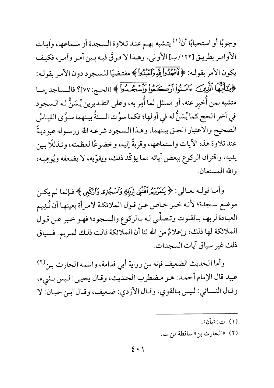وجوبًا أو استحبابًا أن (¬١) يتشبه بهم عند تلاوة السجدة أو سماعها، وآيات الأوامر بطريق [١٢٢/ب] الأولى. وهذا لا فرقَ فيه بين أمر وأمر، فكيف يكون الأمر بقوله: {فَاسْجُدُوا لِلَّهِ وَاعْبُدُوا} مقتضيًا للسجود دون الأمر بقوله: {يَاأَيُّهَا الَّذِينَ آمَنُوا ارْكَعُوا وَاسْجُدُوا} [الحج: ٧٧]؟ فالساجد إما متشبه بمن أُخبِر عنه، أو ممتثل لما أُمِر به، وعلى التقديرين يُسَنُّ له السجود في آخر الحج كما يُسَنُّ له في أولها؛ فكما سوَّت السنةُ بينهما سوَّى القياسُ الصحيح والاعتبار الحق بينهما. وهذا السجود شرعه الله ورسوله عبوديةً عند تلاوة هذه الآيات واستماعها، وقربةً إليه، وخضوعًا لعظمته، وتذللًا بين يديه، واقتران الركوع ببعض آياته مما يؤكّد ذلك، ويقوّيه، لا يضعفه ويُوهِيه، والله المستعان.