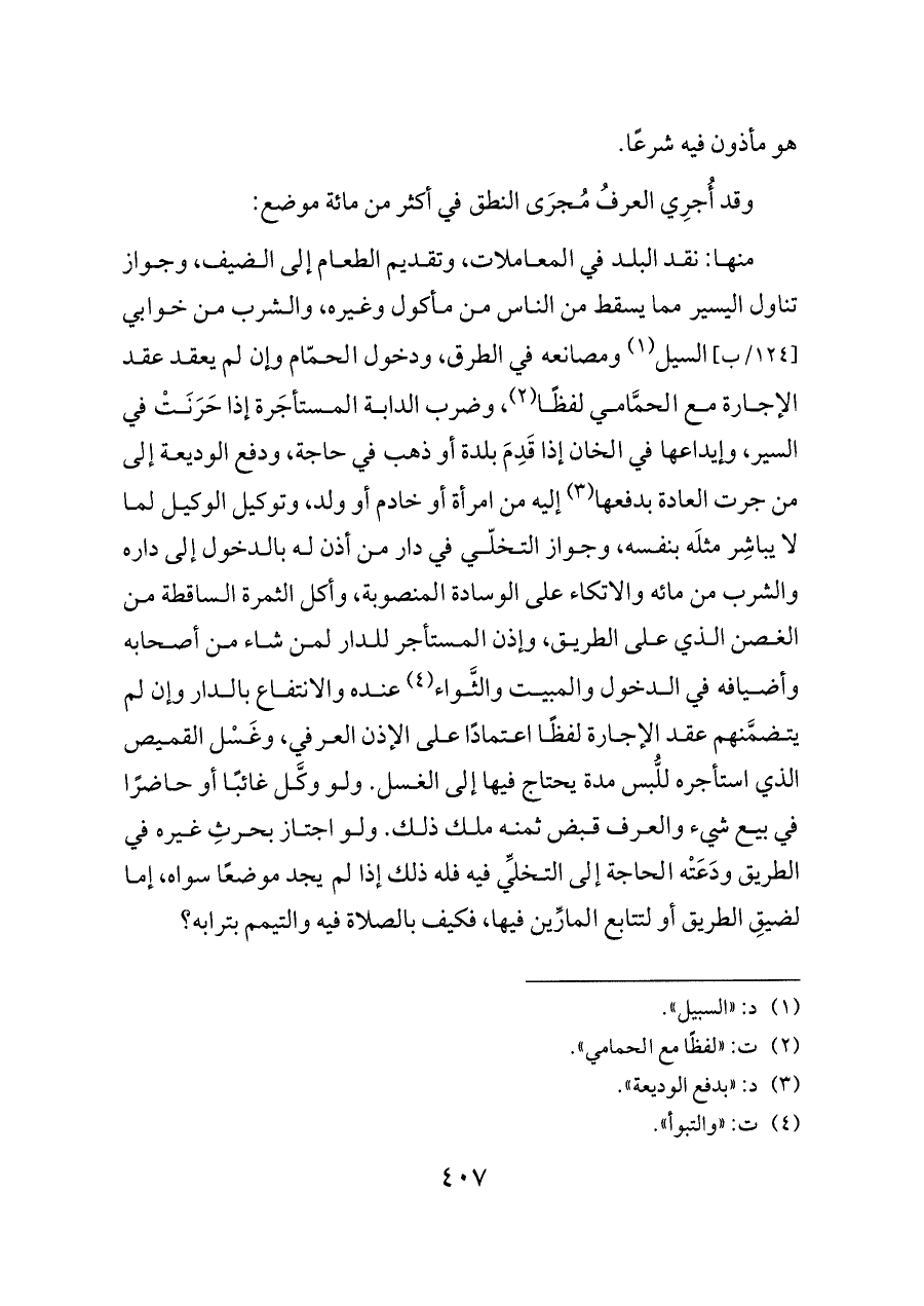 منها: نقد البلد في المعاملات، وتقديم الطعام إلى الضيف، وجواز تناول اليسير مما يسقط من الناس من مأكول وغيره، والشرب من خوابي [١٢٤/ب] السيل (¬١) ومصانعه في الطرق، ودخول الحمّام وإن لم يعقد عقد الإجارة مع الحمَّامي لفظًا (¬٢)، وضرب الدابة المستأجَرة إذا حَرَنَتْ في السير، وإيداعها في الخان إذا قَدِمَ بلدة أو ذهب في حاجة، ودفع الوديعة إلى من جرت العادة بدفعها (¬٣) إليه من امرأة أو خادم أو ولد، وتوكيل الوكيل لما لا يباشِر مثلَه بنفسه، وجواز التخلّي في دار من أذن له بالدخول إلى داره والشرب من مائه والاتكاء على الوسادة المنصوبة، وأكل الثمرة الساقطة من الغصن الذي على الطريق، وإذن المستأجر للدار لمن شاء من أصحابه وأضيافه في الدخول والمبيت والثَّواء (¬٤) عنده والانتفاع بالدار وإن لم يتضمَّنهم عقد الإجارة لفظًا اعتمادًا على الإذن العرفي، وغَسْل القميص الذي استأجره للُّبس مدة يحتاج فيها إلى الغسل. ولو وكَّل غائبًا أو حاضرًا في بيع شيء والعرف قبض ثمنه ملك ذلك. ولو اجتاز بحرثِ غيره في الطريق ودَعَتْه الحاجة إلى التخلِّي فيه فله ذلك إذا لم يجد موضعًا سواه، إما لضيقِ الطريق أو لتتابع المارِّين فيها، فكيف بالصلاة فيه والتيمم بترابه؟