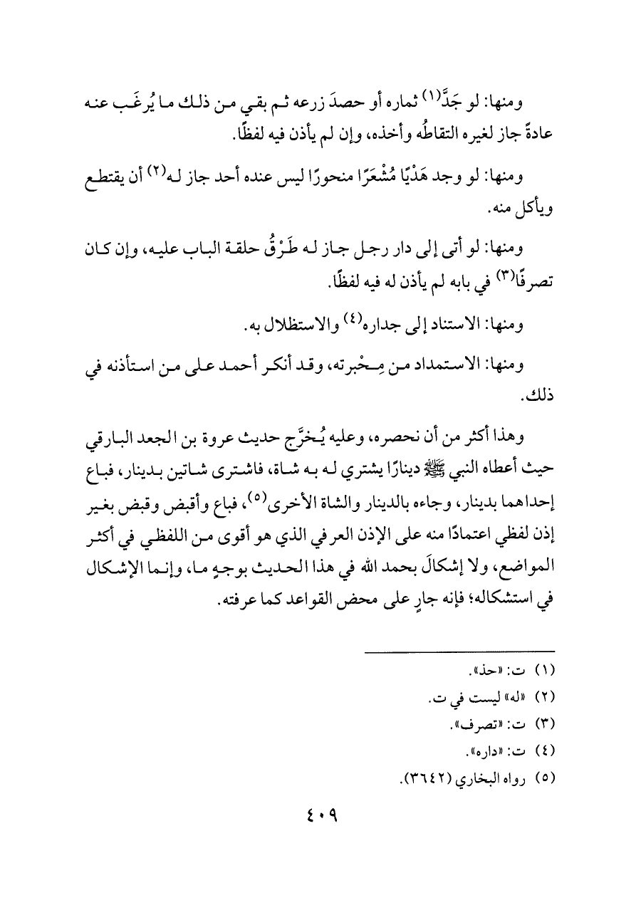 وهذا أكثر من أن نحصره، وعليه يُخرَّج حديث عروة بن الجعد البارقي حيث أعطاه النبي - صلى الله عليه وسلم - دينارًا يشتري له به شاة، فاشترى شاتين بدينار، فباع إحداهما بدينار، وجاءه بالدينار والشاة الأخرى (¬٥)، فباع وأقبض وقبض بغير إذن لفظي اعتمادًا منه على الإذن العرفي الذي هو أقوى من اللفظي في أكثر المواضع، ولا إشكالَ بحمد الله في هذا الحديث بوجهٍ ما، وإنما الإشكال في استشكاله؛ فإنه جارٍ على محض القواعد كما عرفته.