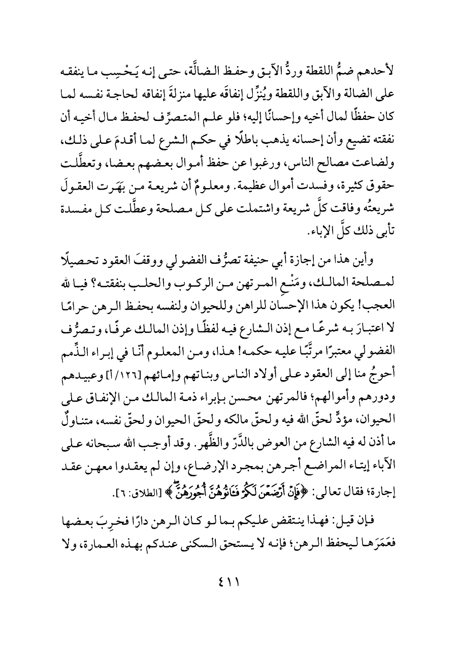 وأين هذا من إجازة أبي حنيفة تصرُّف الفضولي ووقفَ العقود تحصيلًا لمصلحة المالك، ومَنْعِ المرتهن من الركوب والحلب بنفقته؟ فيا لله العجب! يكون هذا الإحسان للراهن وللحيوان ولنفسه بحفظ الرهن حرامًا لا اعتبارَ به شرعًا مع إذن الشارع فيه لفظًا وإذن المالك عرفًا، وتصرُّف الفضولي معتبرًا مرتَّبًا عليه حكمه! هذا، ومن المعلوم أنّا في إبراء الذِّمم أحوجُ منا إلى العقود على أولاد الناس وبناتهم وإمائهم [١٢٦/أ] وعبيدهم ودورهم وأموالهم؛ فالمرتهن محسن بإبراء ذمة المالك من الإنفاق على الحيوان، مؤدٍّ لحقّ الله فيه ولحقّ مالكه ولحقّ الحيوان ولحقّ نفسه، متناولٌ ما أذن له فيه الشارع من العوض بالدَّرّ والظَّهر. وقد أوجب الله سبحانه على الآباء إيتاء المراضع أجرهن بمجرد الإرضاع، وإن لم يعقدوا معهن عقد إجارة؛ فقال تعالى: {فَإِنْ أَرْضَعْنَ لَكُمْ فَآتُوهُنَّ أُجُورَهُنَّ} [الطلاق: ٦].