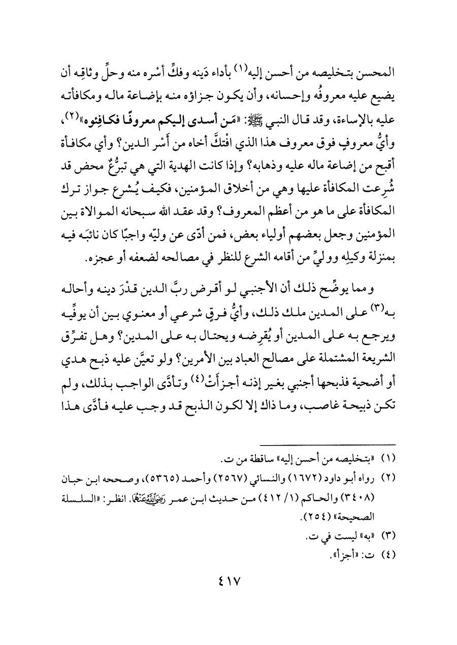 المحسن بتخليصه من أحسن إليه (¬١) بأداء دَينه وفكِّ أسْره منه وحلِّ وثاقِه أن يضيع عليه معروفُه وإحسانه، وأن يكون جزاؤه منه بإضاعة ماله ومكافأته عليه بالإساءة، وقد قال النبي - صلى الله عليه وسلم -: «مَن أسدى إليكم معروفًا فكافِئوه» (¬٢)، وأيُّ معروفٍ فوق معروف هذا الذي افْتكَّ أخاه من أَسْر الدين؟ وأي مكافأة أقبح من إضاعة ماله عليه وذهابه؟ وإذا كانت الهدية التي هي تبرُّعٌ محض قد شُرِعت المكافأة عليها وهي من أخلاق المؤمنين، فكيف يُشرع جواز ترك المكافأة على ما هو من أعظم المعروف؟ وقد عقد الله سبحانه الموالاة بين المؤمنين وجعل بعضهم أولياء بعض، فمن أدّى عن وليّه واجبًا كان نائبَه فيه بمنزلة وكيلِه ووليِّ من أقامه الشرع للنظر في مصالحه لضعفه أو عجزه.