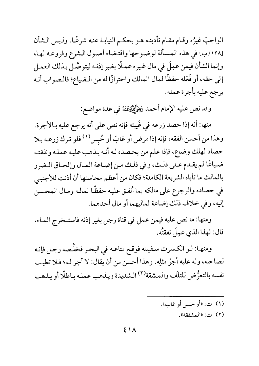 ومنها: ما نص عليه فيمن عمل في قناة رجل بغير إذنه فاستخرج الماء، قال: لهذا الذي عمِلَ نفقتُه.