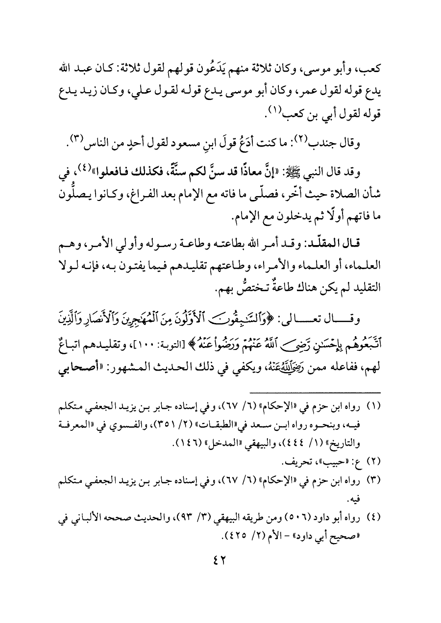 وقال تعالى: {وَالسَّابِقُونَ الْأَوَّلُونَ مِنَ الْمُهَاجِرِينَ وَالْأَنْصَارِ وَالَّذِينَ اتَّبَعُوهُمْ بِإِحْسَانٍ رَضِيَ اللَّهُ عَنْهُمْ وَرَضُوا عَنْهُ} [التوبة: ١٠٠]، وتقليدهم اتباعٌ لهم، ففاعله ممن - رضي الله عنه -، ويكفي في ذلك الحديث المشهور: «أصحابي