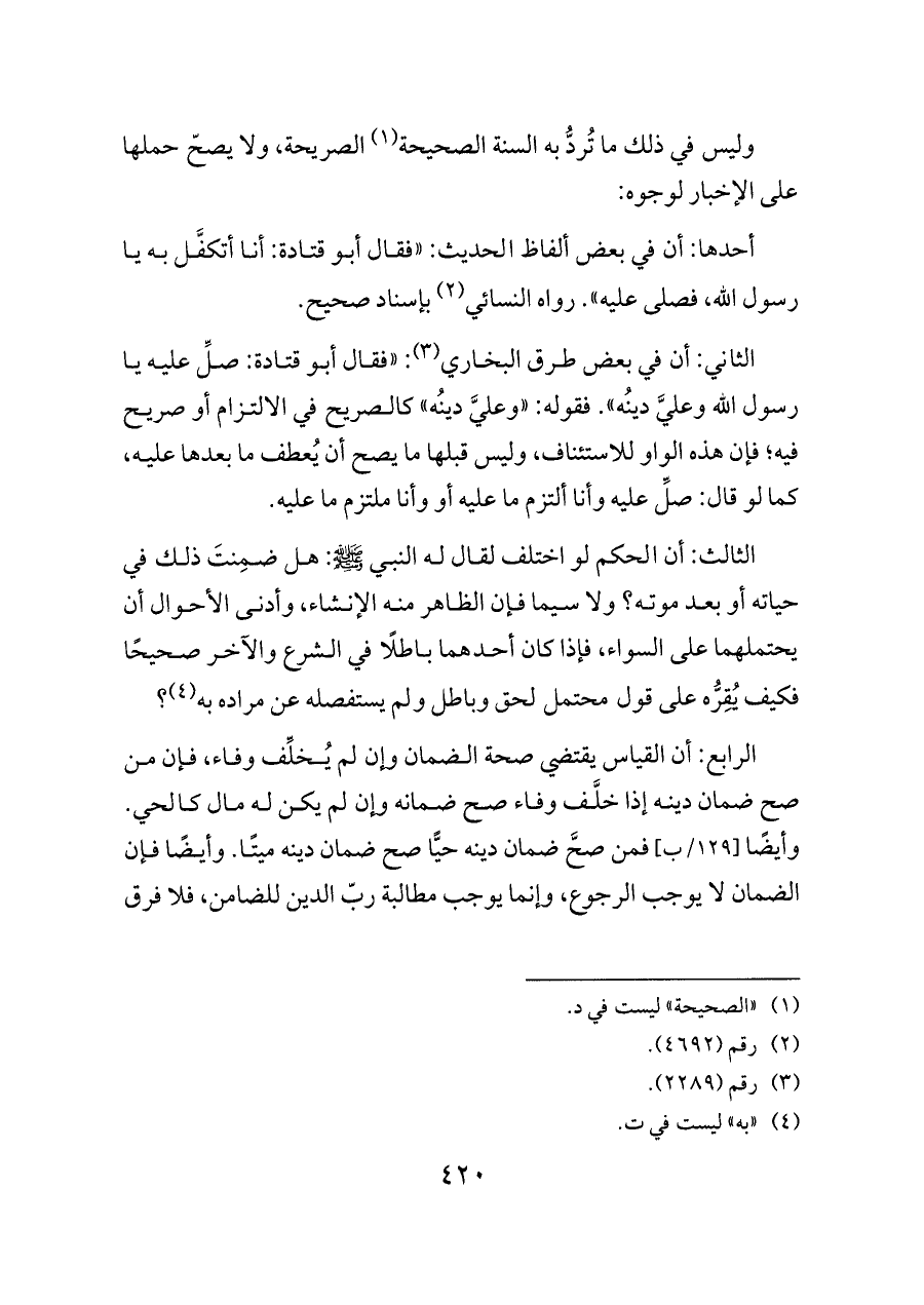 الثاني: أن في بعض طرق البخاري (¬٣): «فقال أبو قتادة: صلِّ عليه يا رسول الله وعليَّ دينُه». فقوله: «وعليَّ دينُه» كالصريح في الالتزام أو صريح فيه؛ فإن هذه الواو للاستئناف، وليس قبلها ما يصح أن يُعطف ما بعدها عليه، كما لو قال: صلِّ عليه وأنا ألتزم ما عليه أو وأنا ملتزم ما عليه.