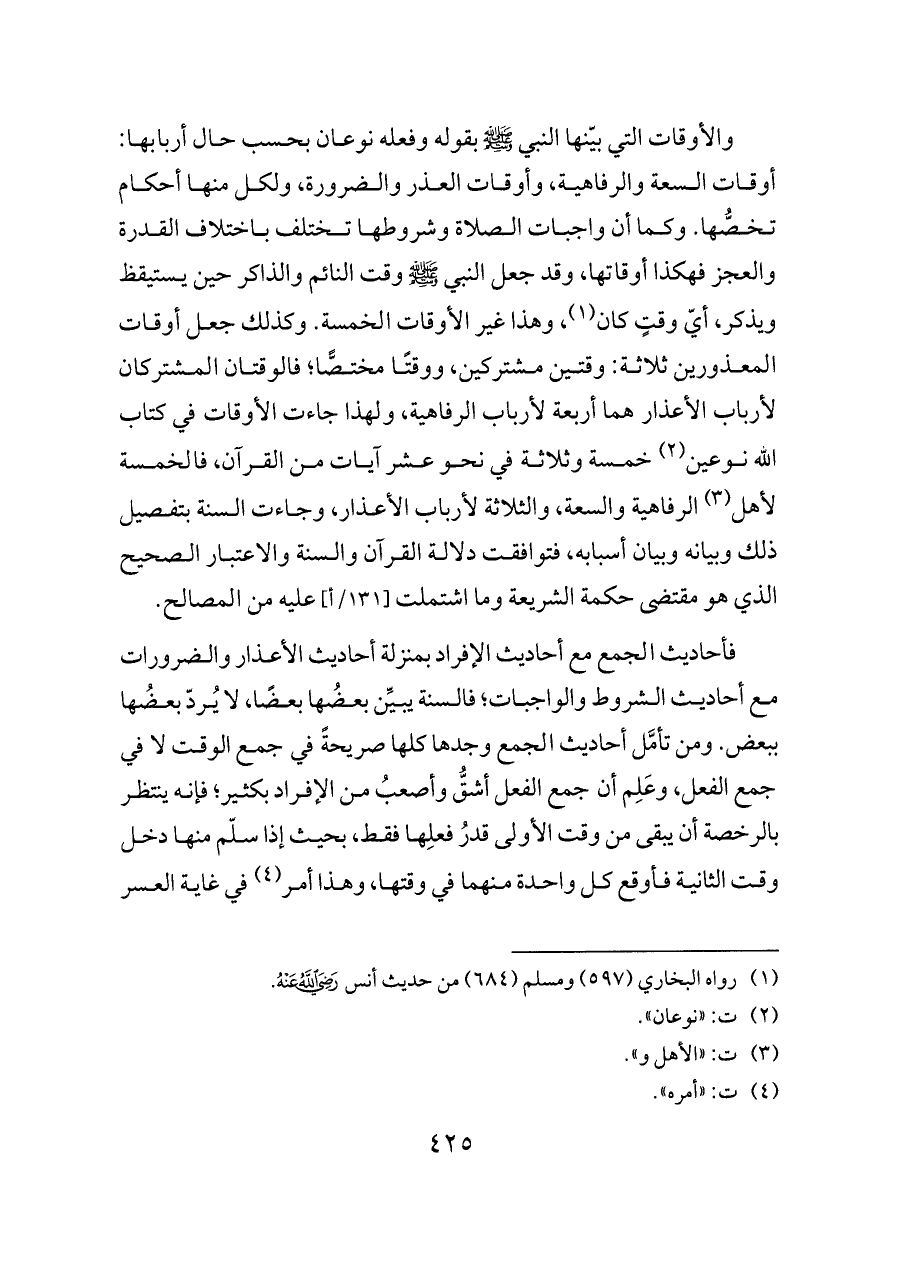 والأوقات التي بيّنها النبي - صلى الله عليه وسلم - بقوله وفعله نوعان بحسب حال أربابها: أوقات السعة والرفاهية، وأوقات العذر والضرورة، ولكل منها أحكام تخصُّها. وكما أن واجبات الصلاة وشروطها تختلف باختلاف القدرة والعجز فهكذا أوقاتها، وقد جعل النبي - صلى الله عليه وسلم - وقت النائم والذاكر حين يستيقظ ويذكر، أيّ وقتٍ كان (¬١)، وهذا غير الأوقات الخمسة. وكذلك جعل أوقات المعذورين ثلاثة: وقتين مشتركين، ووقتًا مختصًّا؛ فالوقتان المشتركان لأرباب الأعذار هما أربعة لأرباب الرفاهية، ولهذا جاءت الأوقات في كتاب الله نوعين (¬٢) خمسة وثلاثة في نحو عشر آيات من القرآن، فالخمسة لأهل (¬٣) الرفاهية والسعة، والثلاثة لأرباب الأعذار، وجاءت السنة بتفصيل ذلك وبيانه وبيان أسبابه، فتوافقت دلالة القرآن والسنة والاعتبار الصحيح الذي هو مقتضى حكمة الشريعة وما اشتملت [١٣١/أ] عليه من المصالح.