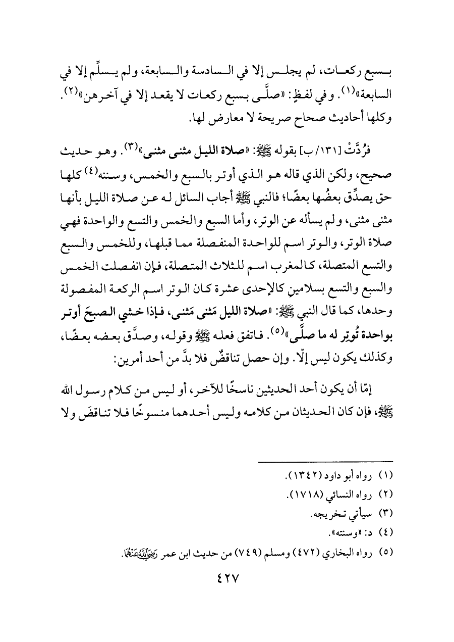 فرُدَّتْ [١٣١/ب] بقوله - صلى الله عليه وسلم -: «صلاة الليل مثنى مثنى» (¬٣). وهو حديث صحيح، ولكن الذي قاله هو الذي أوتر بالسبع والخمس، وسننه (¬٤) كلها حق يصدِّق بعضُها بعضًا؛ فالنبي - صلى الله عليه وسلم - أجاب السائل له عن صلاة الليل بأنها مثنى مثنى، ولم يسأله عن الوتر، وأما السبع والخمس والتسع والواحدة فهي صلاة الوتر، والوتر اسم للواحدة المنفصلة مما قبلها، وللخمس والسبع والتسع المتصلة، كالمغرب اسم للثلاث المتصلة، فإن انفصلت الخمس والسبع والتسع بسلامينِ كالإحدى عشرة كان الوتر اسم الركعة المفصولة وحدها، كما قال النبي - صلى الله عليه وسلم -: «صلاة الليل مَثنى مَثنى، فإذا خشي الصبحَ أوتر بواحدة تُوتِر له ما صلَّى» (¬٥). فاتفق فعله - صلى الله عليه وسلم - وقوله، وصدَّق بعضه بعضًا، وكذلك يكون ليس إلّا. وإن حصل تناقضٌ فلا بدَّ من أحد أمرين: