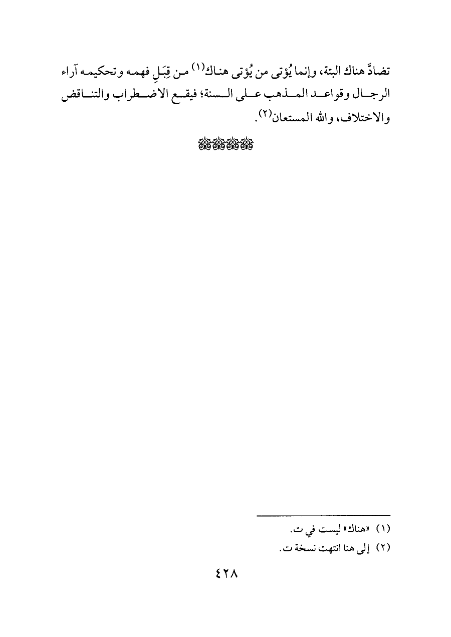 تضادَّ هناك البتة، وإنما يُؤتى من يُؤتى هناك (¬١) من قِبَلِ فهمه وتحكيمه آراء الرجال وقواعد المذهب على السنة؛ فيقع الاضطراب والتناقض والاختلاف، والله المستعان (¬٢).