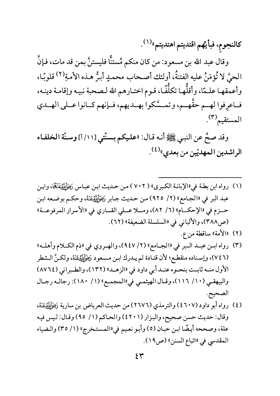 وقد صحَّ عن النبي - صلى الله عليه وسلم - أنه قال: «عليكم بسنّتي [١١/أ] وسنّة الخلفاء الراشدين المهديّين من بعدي» (¬٤).