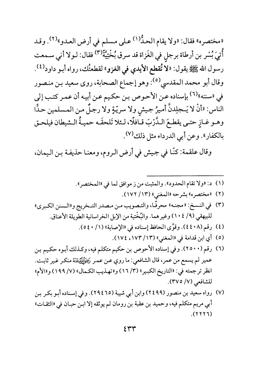 «مختصره» فقال: «ولا يقام الحدُّ (¬١) على مسلم في أرض العدو» (¬٢). وقد أُتِيَ بُسْر بن أرطاة برجلٍ في الغَزاة قد سرق بُخْتِيَّةً (¬٣) فقال: لولا أني سمعت رسول الله - صلى الله عليه وسلم - يقول: «لا تُقطع الأيدي في الغزو» لقطعتُك، رواه أبو داود (¬٤). وقال أبو محمد المقدسي (¬٥): وهو إجماع الصحابة، روى سعيد بن منصور في «سننه» (¬٦) بإسناده عن الأحوص بن حكيم عن أبيه أن عمر كتب إلى الناس: «أنْ لا يَجلِدنَّ أميرُ جيشٍ ولا سريّةٍ ولا رجلٌ من المسلمين حدًّا وهو غازٍ حتى يقطعَ الدَّرْبَ قافلًا، لئلا تَلحقَه حميةُ الشيطان فيلحق بالكفار». وعن أبي الدرداء مثل ذلك (¬٧).