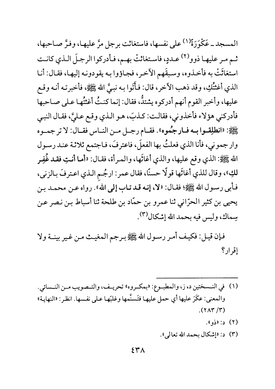 المسجد ــ عَكْوَرَةً (¬١) على نفسها، فاستغاثت برجل مرَّ عليها، وفرَّ صاحبها، ثم مر عليها ذوو (¬٢) عددٍ، فاستغاثتْ بهم، فأدركوا الرجلَ الذي كانت استغاثَتْ به فأخذوه، وسبقَهم الآخر، فجاؤوا به يقودونه إليها، فقال: أنا الذي أغثتُكِ، وقد ذهب الآخر، قال: فأَتَوا به نبيَّ الله - صلى الله عليه وسلم -، فأخبرته أنه وقع عليها، وأخبر القوم أنهم أدركوه يشتدُّ، فقال: إنما كنتُ أغثتُها على صاحبها فأدركني هؤلاء فأخذوني، فقالت: كذبَ، هو الذي وقع عليَّ، فقال النبي - صلى الله عليه وسلم -: «انطلِقوا به فارجُموه». فقام رجل من الناس فقال: لا ترجموه وارجموني، فأنا الذي فعلتُ بها الفعلَ، فاعترفَ، فاجتمع ثلاثة عند رسول الله - صلى الله عليه وسلم -: الذي وقع عليها، والذي أغاثَها، والمرأة، فقال: «أما أنتِ فقد غُفِر لكِ»، وقال للذي أغاثَها قولًا حسنًا، فقال عمر: ارجُمِ الذي اعترفَ بالزنى، فأبى رسول الله - صلى الله عليه وسلم -؛ فقال: «لا، إنه قد تاب إلى الله». رواه عن محمد بن يحيى بن كثير الحرّاني ثنا عمرو بن حمّاد بن طلحة ثنا أسباط بن نصر عن سِماك، وليس فيه بحمد الله إشكال (¬٣).
