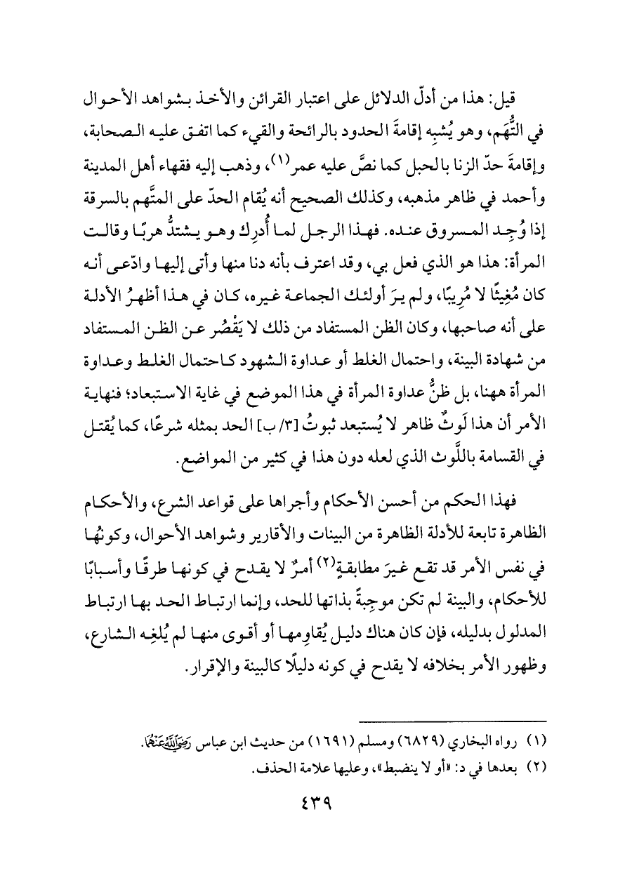 قيل: هذا من أدلّ الدلائل على اعتبار القرائن والأخذ بشواهد الأحوال في التُّهَم، وهو يُشبِه إقامةَ الحدود بالرائحة والقيء كما اتفق عليه الصحابة، وإقامةَ حدّ الزنا بالحبل كما نصَّ عليه عمر (¬١)، وذهب إليه فقهاء أهل المدينة وأحمد في ظاهر مذهبه، وكذلك الصحيح أنه يُقام الحدّ على المتَّهم بالسرقة إذا وُجِد المسروق عنده. فهذا الرجل لما أُدرِك وهو يشتدُّ هربًا وقالت المرأة: هذا هو الذي فعل بي، وقد اعترف بأنه دنا منها وأتى إليها وادّعى أنه كان مُغِيثًا لا مُرِيبًا، ولم يرَ أولئك الجماعة غيره، كان في هذا أظهرُ الأدلة على أنه صاحبها، وكان الظن المستفاد من ذلك لا يَقْصُر عن الظن المستفاد من شهادة البينة، واحتمال الغلط أو عداوة الشهود كاحتمال الغلط وعداوة المرأة ههنا، بل ظنُّ عداوة المرأة في هذا الموضع في غاية الاستبعاد؛ فنهاية الأمر أن هذا لَوثٌ ظاهر لا يُستبعد ثبوتُ [٣/ب] الحد بمثله شرعًا، كما يُقتل في القسامة باللَّوث الذي لعله دون هذا في كثير من المواضع.