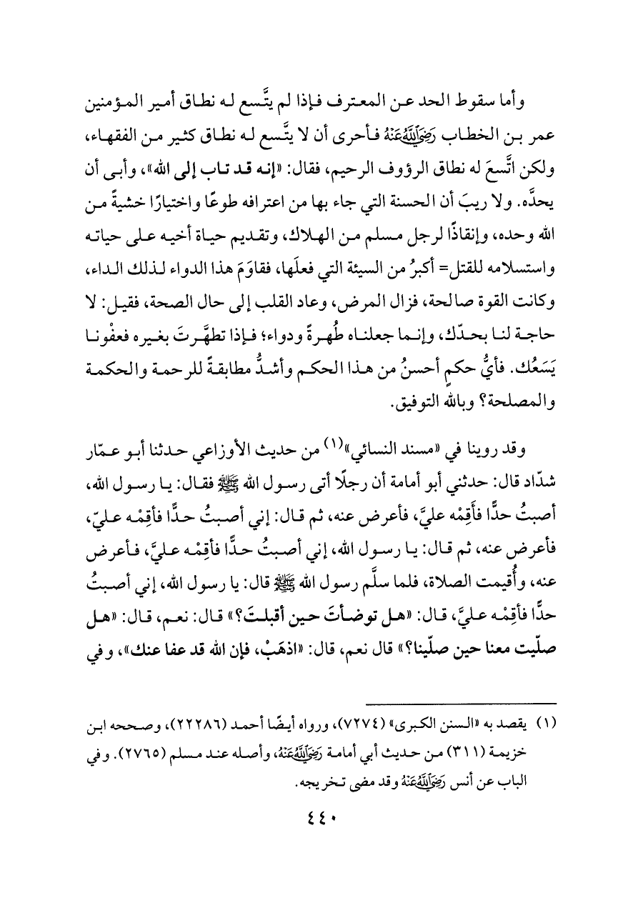 وأما سقوط الحد عن المعترف فإذا لم يتَّسع له نطاق أمير المؤمنين عمر بن الخطاب - رضي الله عنه - فأحرى أن لا يتَّسع له نطاق كثير من الفقهاء، ولكن اتَّسعَ له نطاق الرؤوف الرحيم، فقال: «إنه قد تاب إلى الله»، وأبى أن يحدَّه. ولا ريبَ أن الحسنة التي جاء بها من اعترافه طوعًا واختيارًا خشيةً من الله وحده، وإنقاذًا لرجل مسلم من الهلاك، وتقديم حياة أخيه على حياته واستسلامه للقتل= أكبرُ من السيئة التي فعلَها، فقاوَمَ هذا الدواء لذلك الداء، وكانت القوة صالحة، فزال المرض، وعاد القلب إلى حال الصحة، فقيل: لا حاجة لنا بحدّك، وإنما جعلناه طُهرةً ودواء؛ فإذا تطهَّرتَ بغيره فعفْونا يَسَعُك. فأيُّ حكمٍ أحسنُ من هذا الحكم وأشدُّ مطابقةً للرحمة والحكمة والمصلحة؟ وبالله التوفيق.