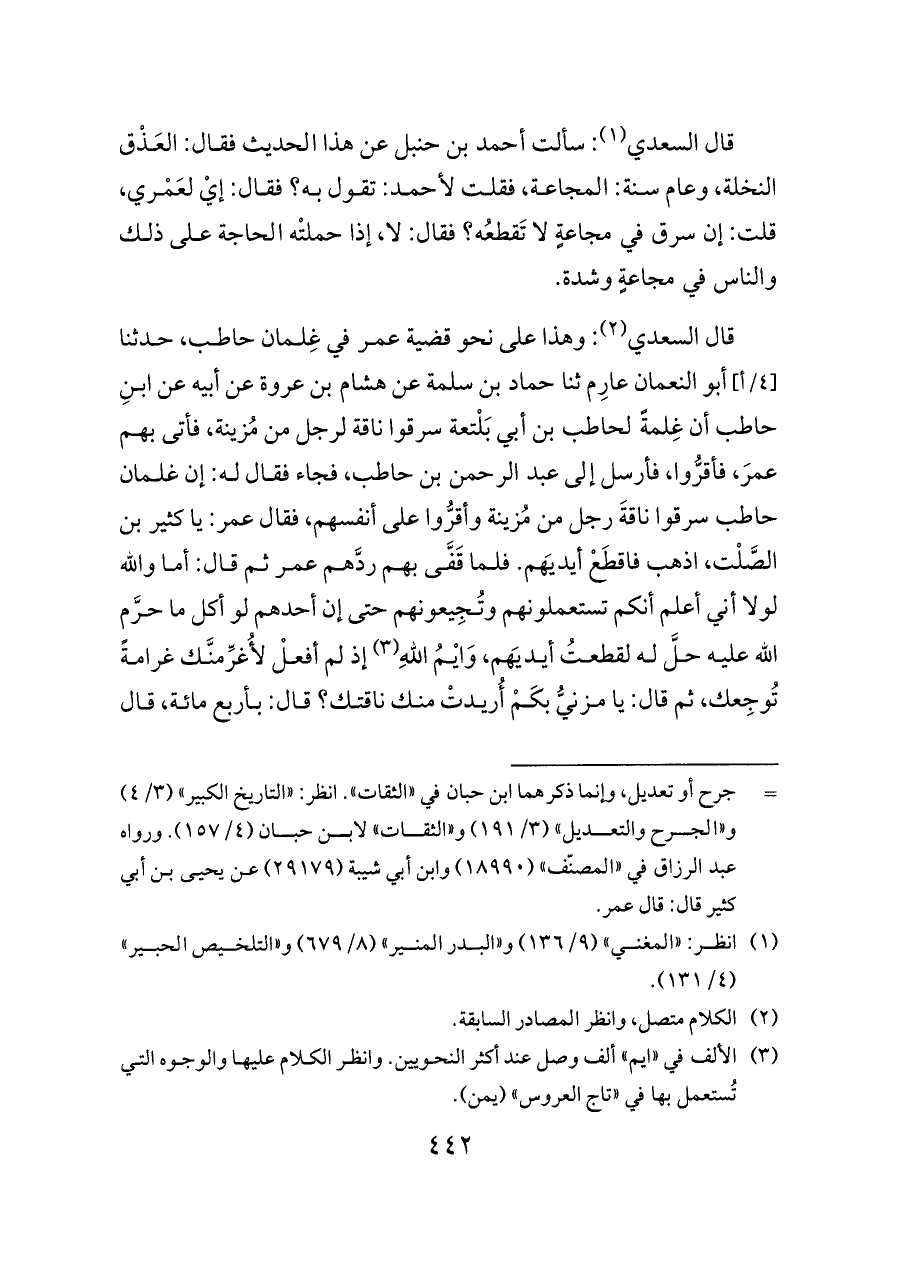 قال السعدي (¬٢): وهذا على نحو قضية عمر في غِلمان حاطب، حدثنا [٤/أ] أبو النعمان عارِم ثنا حماد بن سلمة عن هشام بن عروة عن أبيه عن ابنِ حاطب أن غِلمةً لحاطب بن أبي بَلْتعة سرقوا ناقة لرجل من مُزينة، فأتى بهم عمرَ، فأقرُّوا، فأرسل إلى عبد الرحمن بن حاطب، فجاء فقال له: إن غلمان حاطب سرقوا ناقةَ رجل من مُزينة وأقرُّوا على أنفسهم، فقال عمر: يا كثير بن الصَّلْت، اذهب فاقطَعْ أيديَهم. فلما قَفَّى بهم ردَّهم عمر ثم قال: أما والله لولا أني أعلم أنكم تستعملونهم وتُجِيعونهم حتى إن أحدهم لو أكل ما حرَّم الله عليه حلَّ له لقطعتُ أيديَهم، وَايْمُ اللهِ (¬٣) إذ لم أفعلْ لأُغرِّمنَّك غرامةً تُوجِعك، ثم قال: يا مزنيُّ بكَمْ أُريدتْ منك ناقتك؟ قال: بأربع مائة، قال
