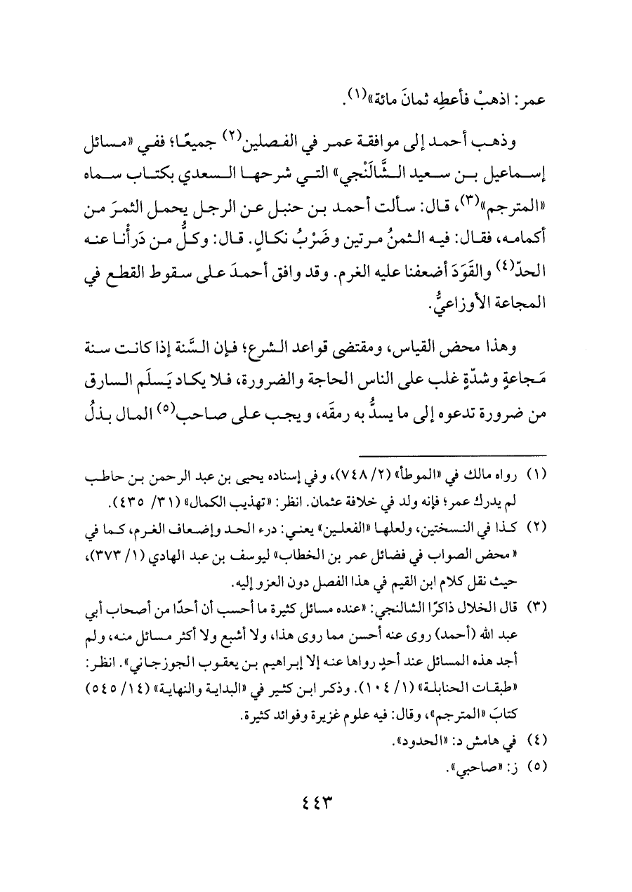 وذهب أحمد إلى موافقة عمر في الفصلين (¬٢) جميعًا؛ ففي «مسائل إسماعيل بن سعيد الشَّالَنْجي» التي شرحها السعدي بكتاب سماه «المترجم» (¬٣)، قال: سألت أحمد بن حنبل عن الرجل يحمل الثمرَ من أكمامه، فقال: فيه الثمنُ مرتين وضَرْبُ نكالٍ. قال: وكلُّ من دَرأْنا عنه الحدّ (¬٤) والقَوَدَ أضعفنا عليه الغرم. وقد وافق أحمدَ على سقوط القطع في المجاعة الأوزاعيُّ.