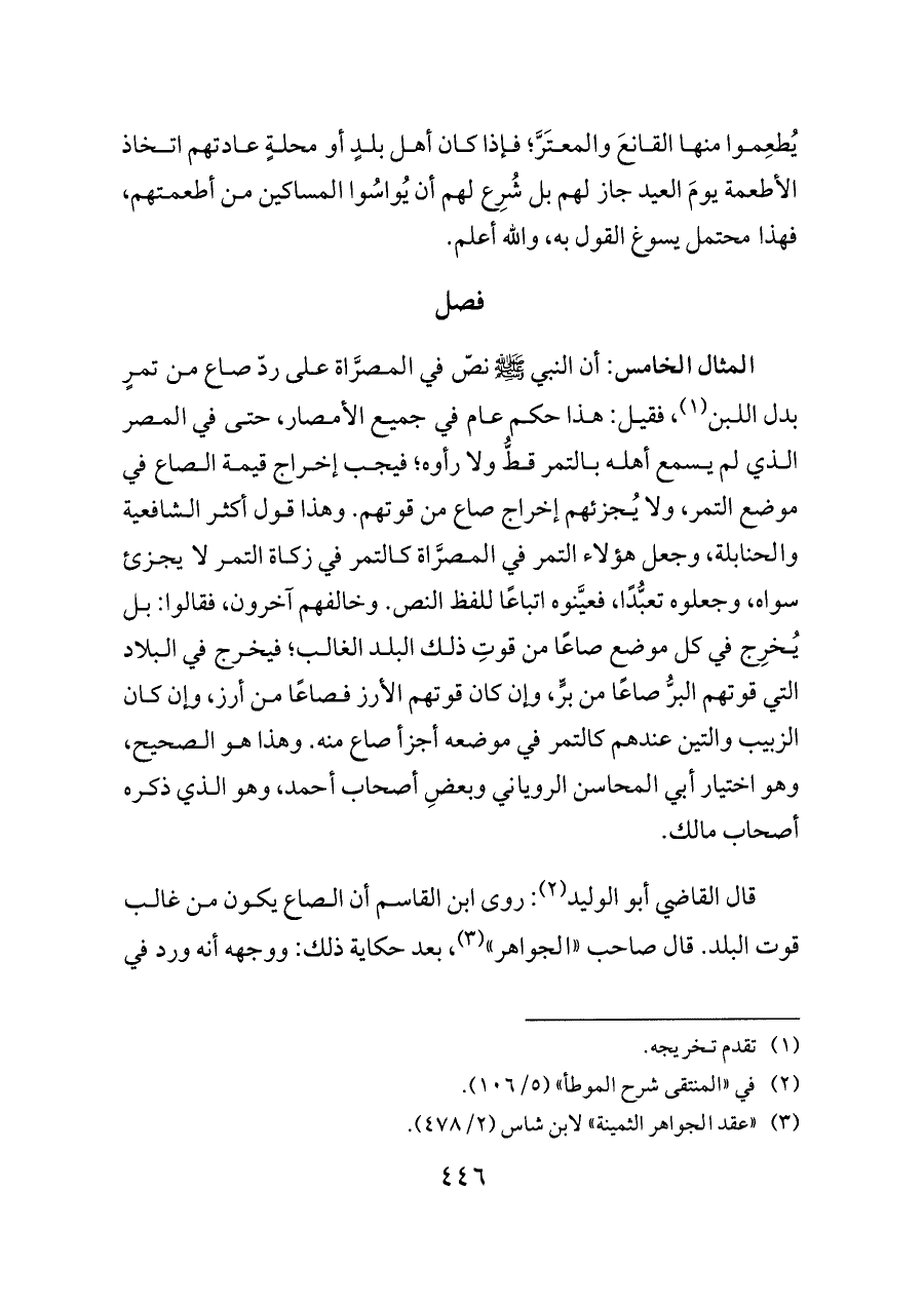 المثال الخامس: أن النبي - صلى الله عليه وسلم - نصّ في المصرَّاة على ردّ صاع من تمرٍ بدل اللبن (¬١)، فقيل: هذا حكم عام في جميع الأمصار، حتى في المصر الذي لم يسمع أهله بالتمر قطُّ ولا رأوه؛ فيجب إخراج قيمة الصاع في موضع التمر، ولا يُجزئهم إخراج صاع من قوتهم. وهذا قول أكثر الشافعية والحنابلة، وجعل هؤلاء التمر في المصرَّاة كالتمر في زكاة التمر لا يجزئ سواه، وجعلوه تعبُّدًا، فعيَّنوه اتباعًا للفظ النص. وخالفهم آخرون، فقالوا: بل يُخرِج في كل موضع صاعًا من قوتِ ذلك البلد الغالب؛ فيخرج في البلاد التي قوتهم البرُّ صاعًا من برٍّ، وإن كان قوتهم الأرز فصاعًا من أرز، وإن كان الزبيب والتين عندهم كالتمر في موضعه أجزأ صاع منه. وهذا هو الصحيح، وهو اختيار أبي المحاسن الروياني وبعضِ أصحاب أحمد، وهو الذي ذكره أصحاب مالك.