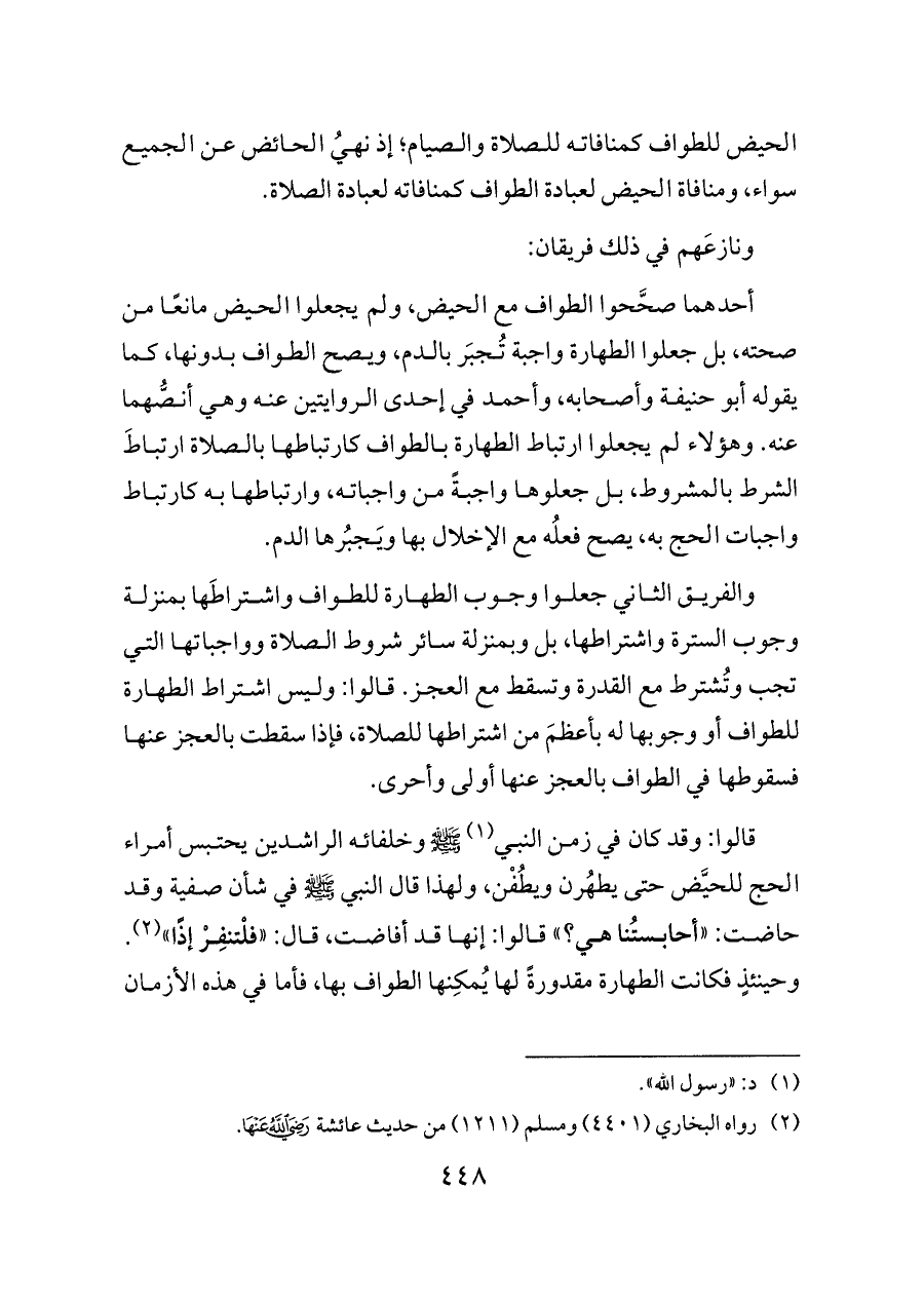 أحدهما صحَّحوا الطواف مع الحيض، ولم يجعلوا الحيض مانعًا من صحته، بل جعلوا الطهارة واجبة تُجبَر بالدم، ويصح الطواف بدونها، كما يقوله أبو حنيفة وأصحابه، وأحمد في إحدى الروايتين عنه وهي أنصُّهما عنه. وهؤلاء لم يجعلوا ارتباط الطهارة بالطواف كارتباطها بالصلاة ارتباطَ الشرط بالمشروط، بل جعلوها واجبةً من واجباته، وارتباطها به كارتباط واجبات الحج به، يصح فعلُه مع الإخلال بها ويَجبُرها الدم.