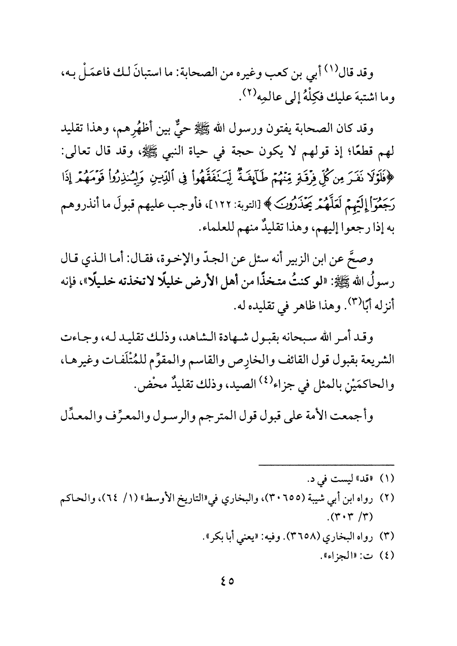 وقد كان الصحابة يفتون ورسول الله - صلى الله عليه وسلم - حيٌّ بين أظهُرِهم، وهذا تقليد لهم قطعًا؛ إذ قولهم لا يكون حجة في حياة النبي - صلى الله عليه وسلم -، وقد قال تعالى: {فَلَوْلَا نَفَرَ مِنْ كُلِّ فِرْقَةٍ مِنْهُمْ طَائِفَةٌ لِيَتَفَقَّهُوا فِي الدِّينِ وَلِيُنْذِرُوا قَوْمَهُمْ إِذَا رَجَعُوا إِلَيْهِمْ لَعَلَّهُمْ يَحْذَرُونَ} [التوبة: ١٢٢]، فأوجب عليهم قبولَ ما أنذروهم به إذا رجعوا إليهم، وهذا تقليدٌ منهم للعلماء.