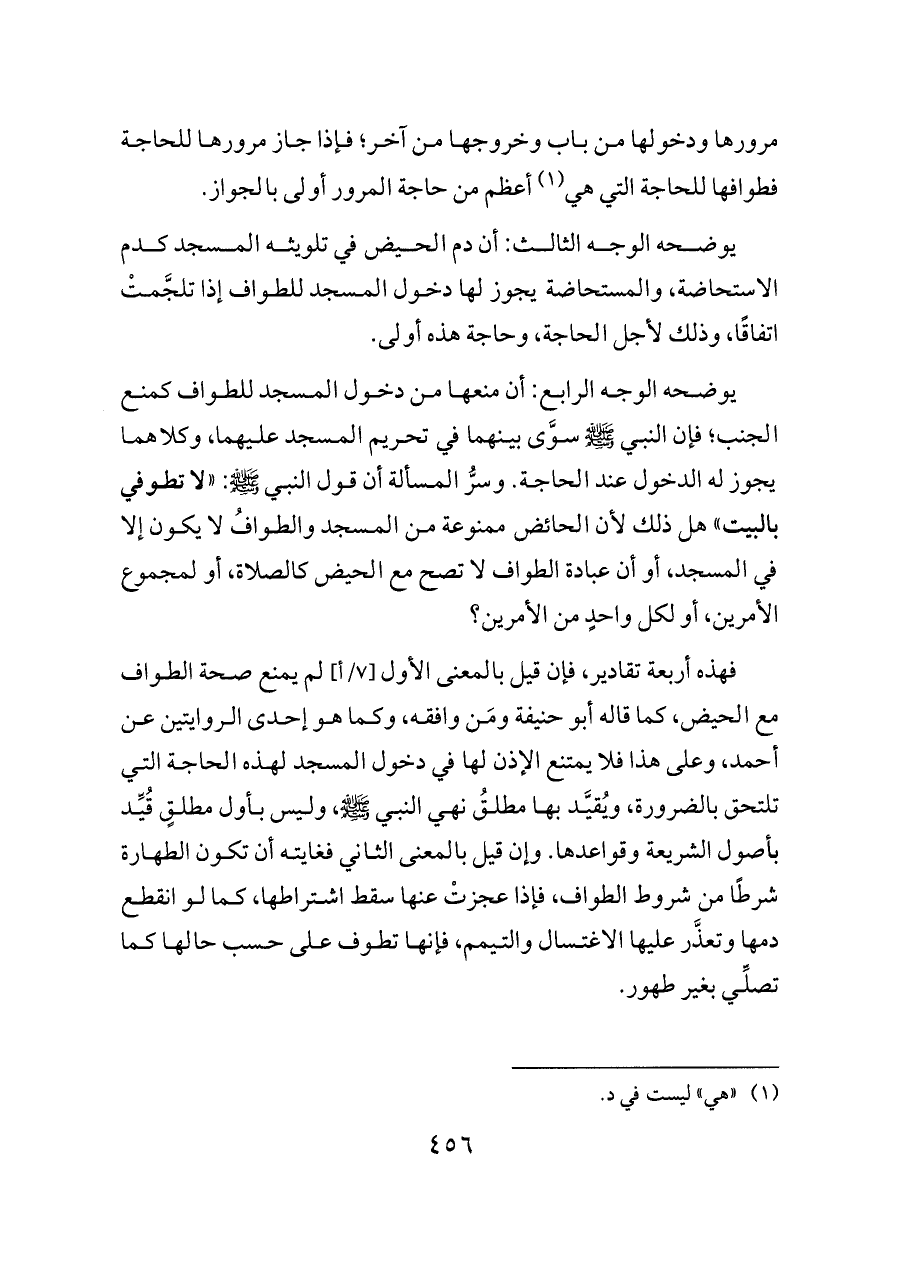 فهذه أربعة تقادير، فإن قيل بالمعنى الأول [٧/أ] لم يمنع صحة الطواف مع الحيض، كما قاله أبو حنيفة ومَن وافقه، وكما هو إحدى الروايتين عن أحمد، وعلى هذا فلا يمتنع الإذن لها في دخول المسجد لهذه الحاجة التي تلتحق بالضرورة، ويُقيَّد بها مطلقُ نهي النبي - صلى الله عليه وسلم -، وليس بأول مطلقٍ قُيِّد بأصول الشريعة وقواعدها. وإن قيل بالمعنى الثاني فغايته أن تكون الطهارة شرطًا من شروط الطواف، فإذا عجزتْ عنها سقط اشتراطها، كما لو انقطع دمها وتعذَّر عليها الاغتسال والتيمم، فإنها تطوف على حسب حالها كما تصلِّي بغير طهور.