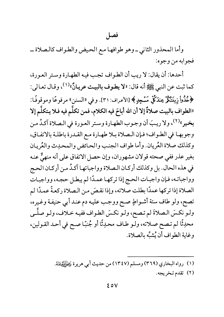 أحدها: أن يقال: لا ريب أن الطواف تجب فيه الطهارة وستر العورة، كما ثبت عن النبي - صلى الله عليه وسلم - أنه قال: «لا يطوف بالبيت عريانٌ» (¬١)، وقال تعالى: {خُذُوا زِينَتَكُمْ عِنْدَ كُلِّ مَسْجِدٍ} [الأعراف: ٣١]. وفي «السنن» مرفوعًا وموقوفًا: «الطواف بالبيت صلاةٌ إلا أن الله أباحَ فيه الكلام، فمن تكلَّم فيه فلا يتكلَّم إلا بخير» (¬٢)، ولا ريبَ أن وجوب الطهارة وستر العورة في الصلاة آكدُ من وجوبها في الطواف؛ فإن الصلاة بلا طهارة مع القدرة باطلة بالاتفاق، وكذلك صلاة العُريان. وأما طواف الجنب والحائض والمحدِث والعُريان بغير عذر ففي صحته قولان مشهوران، وإن حصل الاتفاق على أنه منهيٌّ عنه في هذه الحال. بل وكذلك أركان الصلاة وواجباتها آكدُ من أركان الحج وواجباته، فإن واجبات الحج إذا تركها عمدًا لم يبطل حجه، وواجبات الصلاة إذا تركها عمدًا بطلت صلاته، وإذا نقصَ من الصلاة ركعةً عمدًا لم تصح، ولو طاف ستة أشواطٍ صح ووجب عليه دم عند أبي حنيفة وغيره، ولو نكسَ الصلاةَ لم تصح، ولو نكسَ الطواف ففيه خلاف، ولو صلَّى محدِثًا لم تصح صلاته، ولو طاف محدِثًا أو جُنبًا صح في أحد القولين، وغاية الطواف أن يُشبَّه بالصلاة.