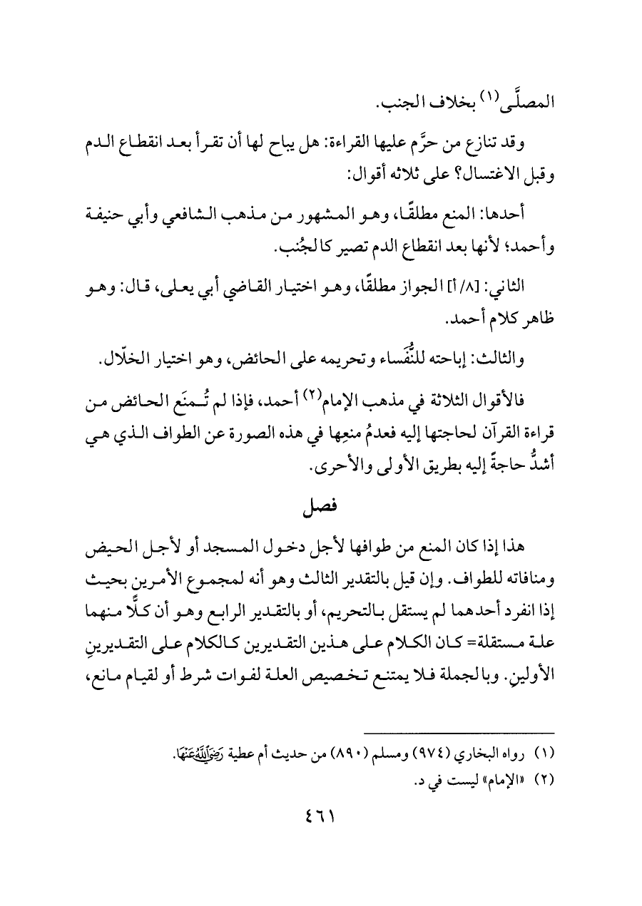 فالأقوال الثلاثة في مذهب الإمام (¬٢) أحمد، فإذا لم تُمنَع الحائض من قراءة القرآن لحاجتها إليه فعدمُ منعِها في هذه الصورة عن الطواف الذي هي أشدُّ حاجةً إليه بطريق الأولى والأحرى.