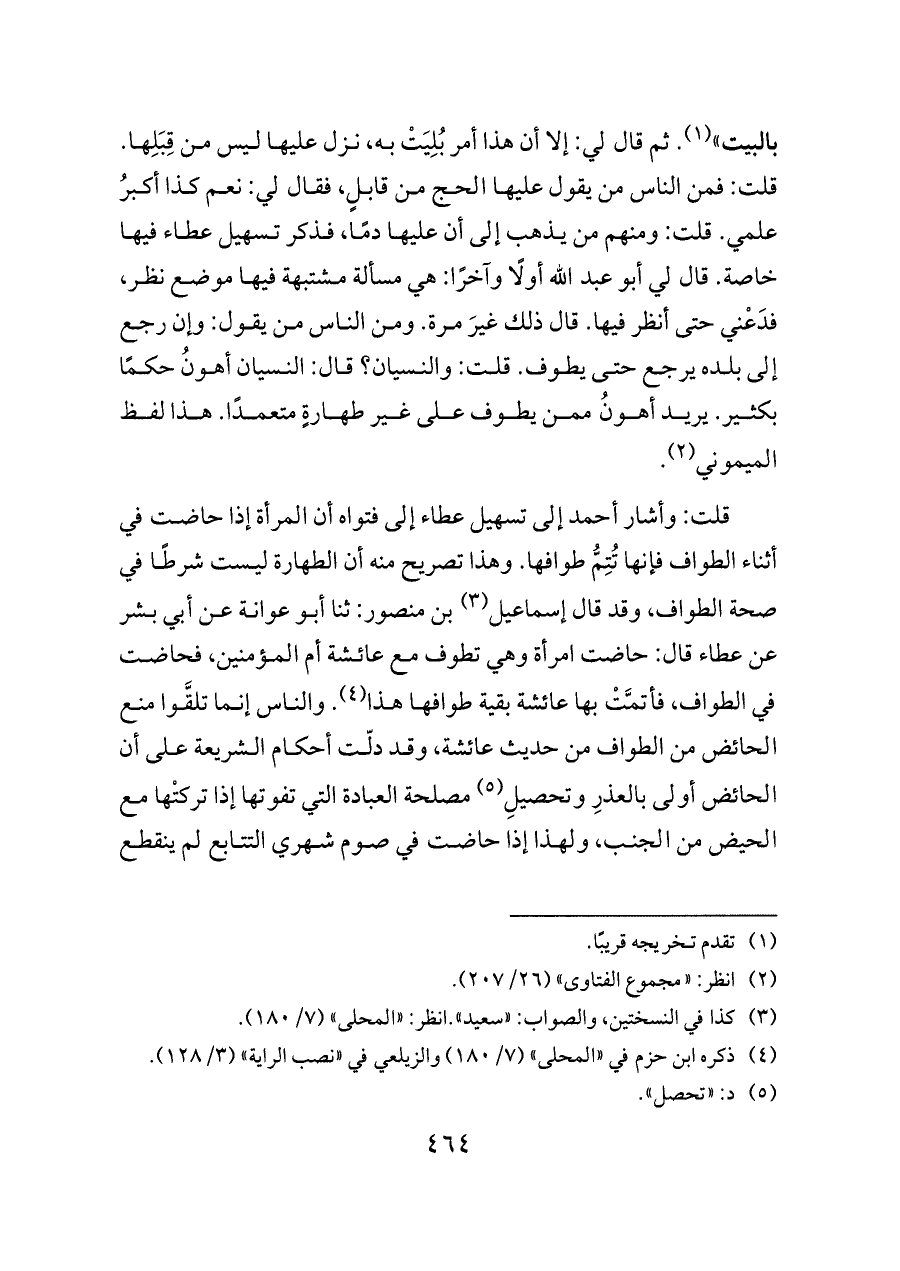 قلت: وأشار أحمد إلى تسهيل عطاء إلى فتواه أن المرأة إذا حاضت في أثناء الطواف فإنها تُتِمُّ طوافها. وهذا تصريح منه أن الطهارة ليست شرطًا في صحة الطواف، وقد قال إسماعيل (¬٣) بن منصور: ثنا أبو عوانة عن أبي بشر عن عطاء قال: حاضت امرأة وهي تطوف مع عائشة أم المؤمنين، فحاضت في الطواف، فأتمَّتْ بها عائشة بقية طوافها هذا (¬٤). والناس إنما تلقَّوا منع الحائض من الطواف من حديث عائشة، وقد دلّت أحكام الشريعة على أن الحائض أولى بالعذرِ وتحصيلِ (¬٥) مصلحة العبادة التي تفوتها إذا تركتْها مع الحيض من الجنب، ولهذا إذا حاضت في صوم شهري التتابع لم ينقطع