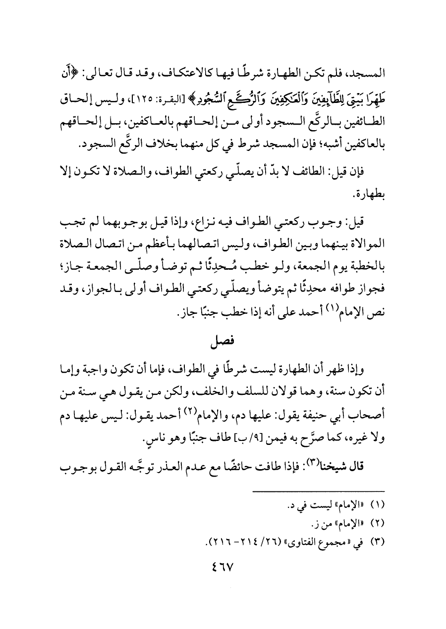 المسجد، فلم تكن الطهارة شرطًا فيها كالاعتكاف، وقد قال تعالى: {أَنْ طَهِّرَا بَيْتِيَ لِلطَّائِفِينَ وَالْعَاكِفِينَ وَالرُّكَّعِ السُّجُودِ} [البقرة: ١٢٥]، وليس إلحاق الطائفين بالركَّع السجود أولى من إلحاقهم بالعاكفين، بل إلحاقهم بالعاكفين أشبه؛ فإن المسجد شرط في كل منهما بخلاف الركَّع السجود.