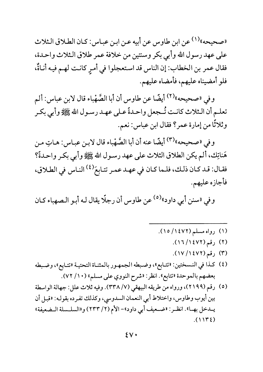 «صحيحه» (¬١) عن ابن طاوس عن أبيه عن ابن عباس: كان الطلاق الثلاث على عهد رسول الله وأبي بكر وسنتين من خلافة عمر طلاق الثلاث واحدة، فقال عمر بن الخطاب: إن الناس قد استعجلوا في أمرٍ كانت لهم فيه أناةٌ، فلو أمضيناه عليهم، فأمضاه عليهم.