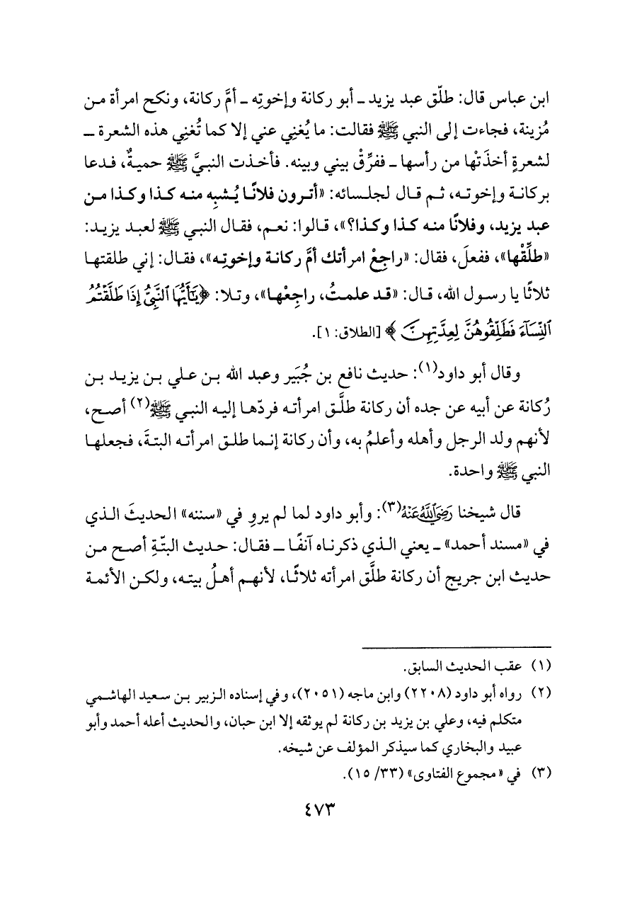 قال شيخنا - رضي الله عنه - (¬٣): وأبو داود لما لم يروِ في «سننه» الحديثَ الذي في «مسند أحمد» ــ يعني الذي ذكرناه آنفًا ــ فقال: حديث البتّةِ أصح من حديث ابن جريج أن ركانة طلَّق امرأته ثلاثًا، لأنهم أهلُ بيته، ولكن الأئمة