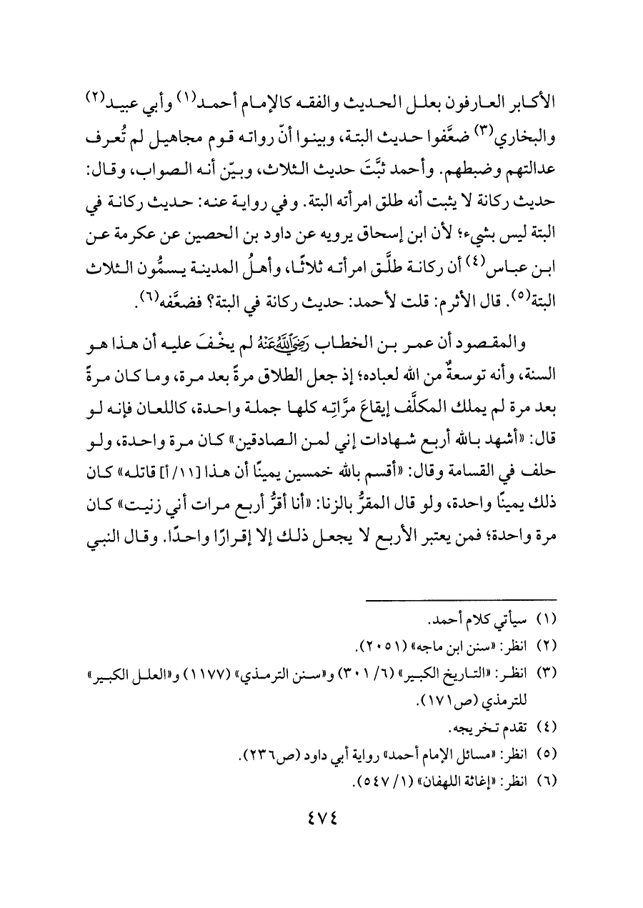 الأكابر العارفون بعلل الحديث والفقه كالإمام أحمد (¬١) وأبي عبيد (¬٢) والبخاري (¬٣) ضعَّفوا حديث البتة، وبينوا أنّ رواته قوم مجاهيل لم تُعرف عدالتهم وضبطهم. وأحمد ثبَّتَ حديث الثلاث، وبيّن أنه الصواب، وقال: حديث ركانة لا يثبت أنه طلق امرأته البتة. وفي رواية عنه: حديث ركانة في البتة ليس بشيء؛ لأن ابن إسحاق يرويه عن داود بن الحصين عن عكرمة عن ابن عباس (¬٤) أن ركانة طلَّق امرأته ثلاثًا، وأهلُ المدينة يسمُّون الثلاث البتة (¬٥). قال الأثرم: قلت لأحمد: حديث ركانة في البتة؟ فضعَّفه (¬٦).