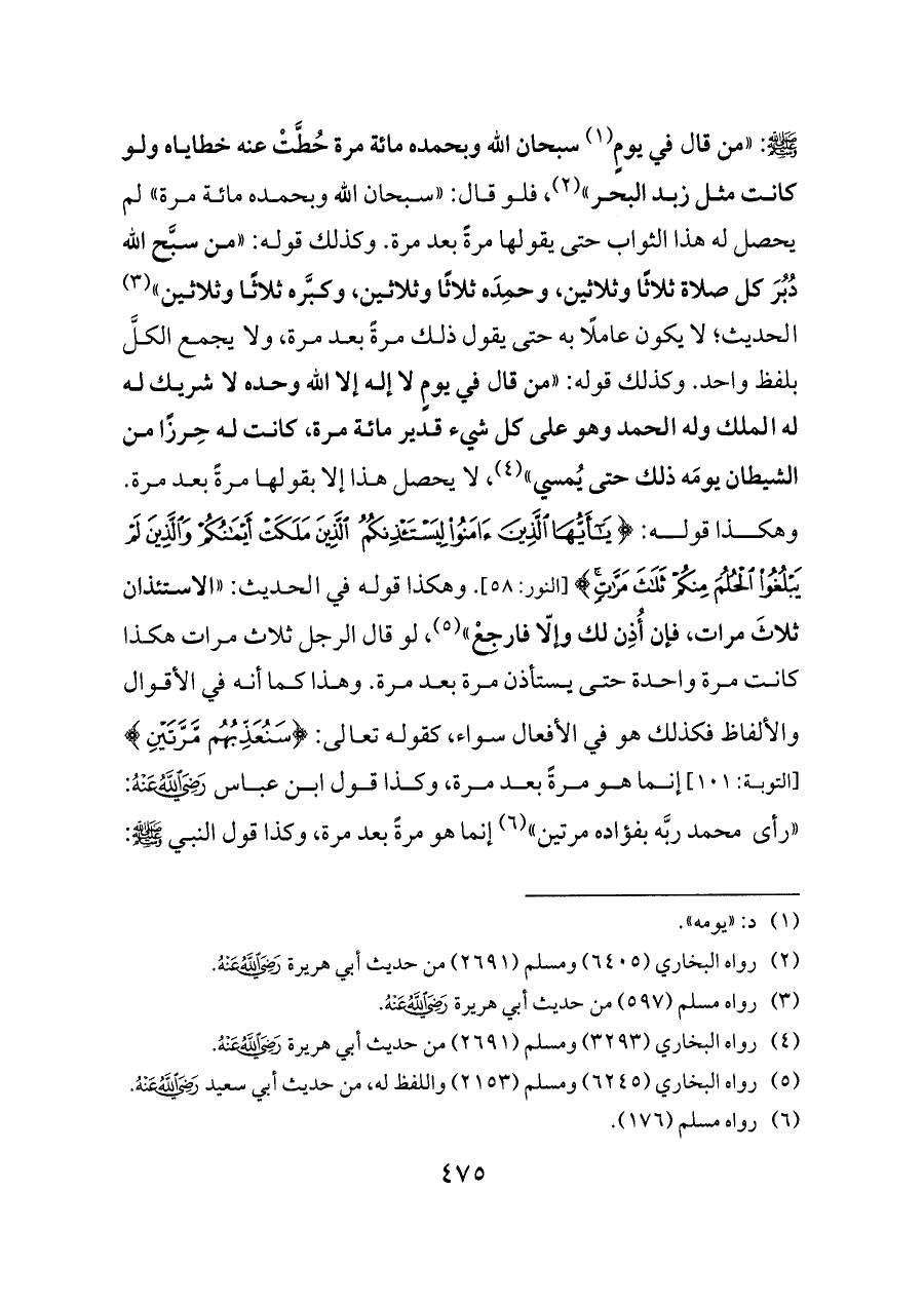 - صلى الله عليه وسلم -: «من قال في يومٍ (¬١) سبحان الله وبحمده مائة مرة حُطَّتْ عنه خطاياه ولو كانت مثل زبد البحر» (¬٢)، فلو قال: «سبحان الله وبحمده مائة مرة» لم يحصل له هذا الثواب حتى يقولها مرةً بعد مرة. وكذلك قوله: «من سبَّح الله دُبُرَ كل صلاة ثلاثًا وثلاثين، وحمِدَه ثلاثًا وثلاثين، وكبَّره ثلاثًا وثلاثين» (¬٣) الحديث؛ لا يكونعاملًا به حتى يقول ذلك مرةً بعد مرة، ولا يجمع الكلَّ بلفظ واحد. وكذلك قوله: «من قال في يومٍ لا إله إلا الله وحده لا شريك له له الملك وله الحمد وهو على كل شيء قدير مائة مرة، كانت له حِرزًا من الشيطان يومَه ذلك حتى يُمسي» (¬٤)، لا يحصل هذا إلا بقولها مرةً بعد مرة. وهكذا قوله: {يَاأَيُّهَا الَّذِينَ آمَنُوا لِيَسْتَأْذِنْكُمُ الَّذِينَ مَلَكَتْ أَيْمَانُكُمْ وَالَّذِينَ لَمْ يَبْلُغُوا الْحُلُمَ مِنْكُمْ ثَلَاثَ مَرَّاتٍ} [النور: ٥٨]. وهكذا قوله في الحديث: «الاستئذان ثلاثَ مرات، فإن أُذِن لك وإلّا فارجِعْ» (¬٥)،