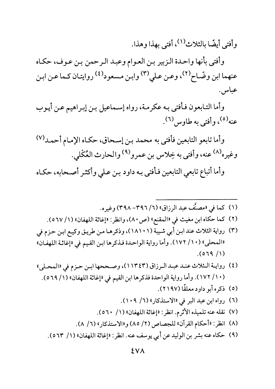 (¬٤) رواية الثلاث عند عبد الرزاق (١١٣٤٣)، وصححها ابن حزم في «المحلى» (١٠/ ١٧٢). وأما رواية الواحدة فذكرها ابن القيم في «إغاثة اللهفان» (١/ ٥٦٩).
