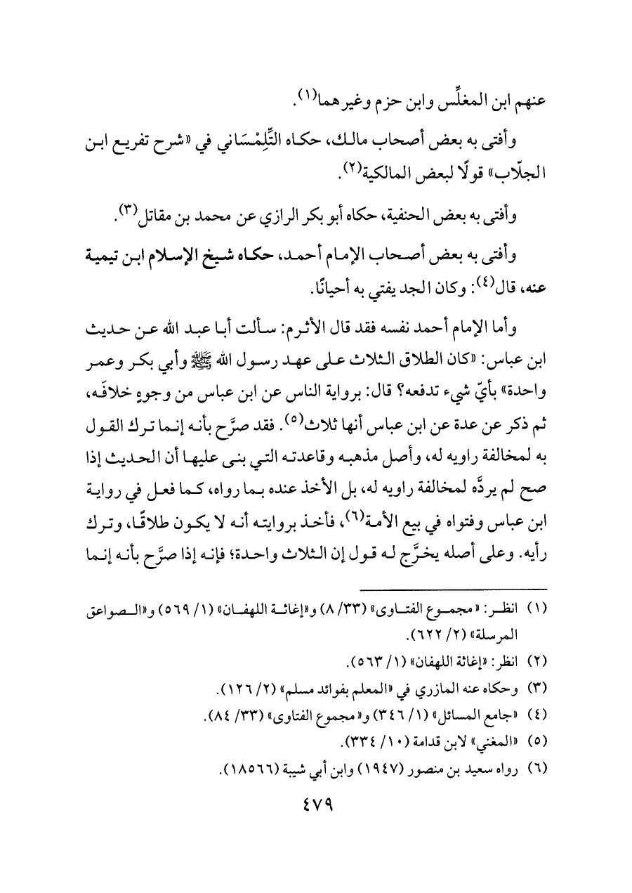 وأما الإمام أحمد نفسه فقد قال الأثرم: سألت أبا عبد الله عن حديث ابن عباس: «كان الطلاق الثلاث على عهد رسول الله - صلى الله عليه وسلم - وأبي بكر وعمر واحدة» بأيّ شيء تدفعه؟ قال: برواية الناس عن ابن عباس من وجوهٍ خلافَه، ثم ذكر عن عدة عن ابن عباس أنها ثلاث (¬٥). فقد صرَّح بأنه إنما ترك القول به لمخالفة راويه له، وأصل مذهبه وقاعدته التي بنى عليها أن الحديث إذا صح لم يردَّه لمخالفة راويه له، بل الأخذ عنده بما رواه، كما فعل في رواية ابن عباس وفتواه في بيع الأمة (¬٦)، فأخذ بروايته أنه لا يكون طلاقًا، وترك رأيه. وعلى أصله يخرَّج له قول إن الثلاث واحدة؛ فإنه إذا صرَّح بأنه إنما