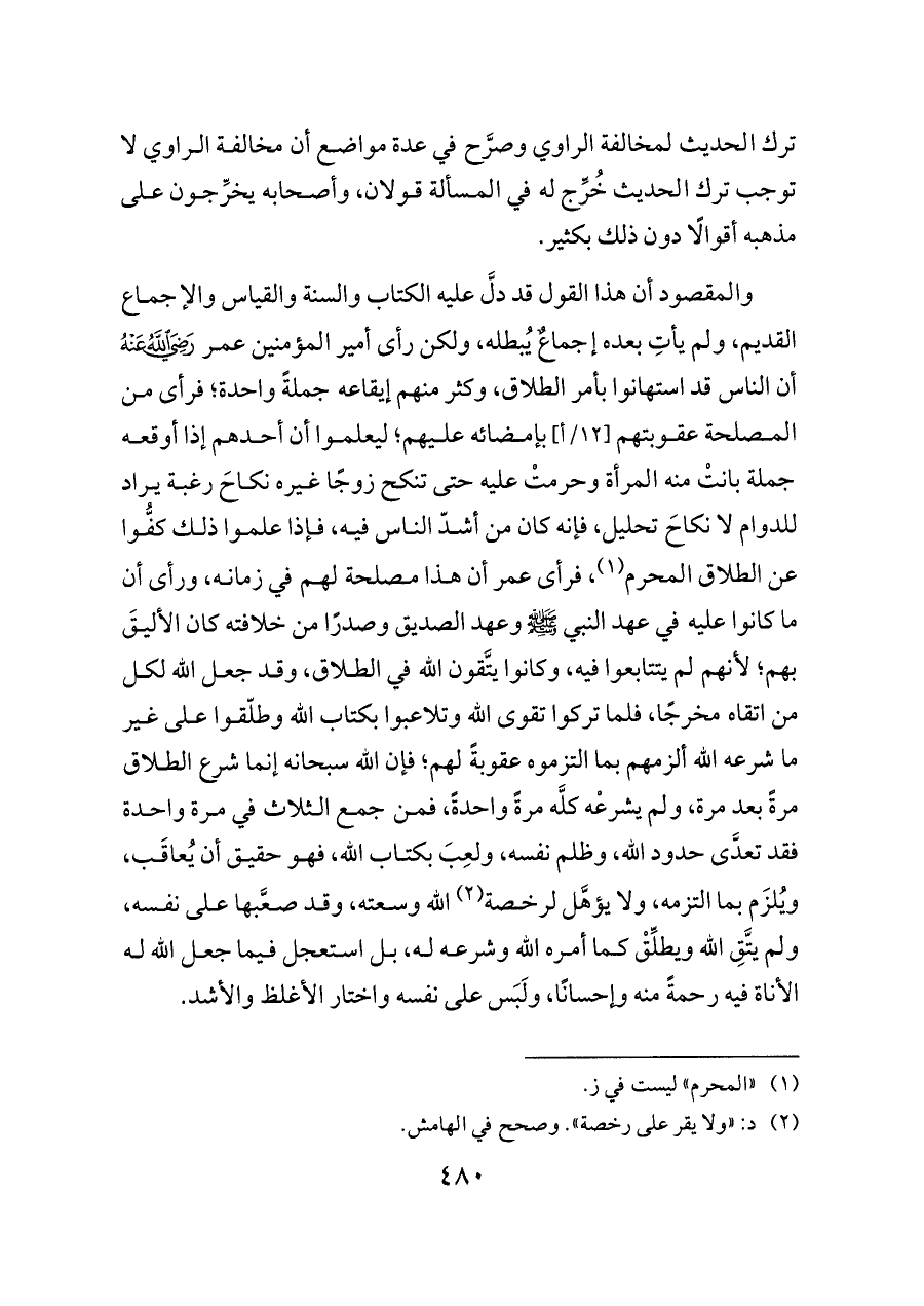 والمقصود أن هذا القول قد دلَّ عليه الكتاب والسنة والقياس والإجماع القديم، ولم يأتِ بعده إجماعٌ يُبطله، ولكن رأى أمير المؤمنين عمر - رضي الله عنه - أن الناس قد استهانوا بأمر الطلاق، وكثر منهم إيقاعه جملةً واحدة؛ فرأى من المصلحة عقوبتهم [١٢/أ] بإمضائه عليهم؛ ليعلموا أن أحدهم إذا أوقعه جملة بانتْ منه المرأة وحرمتْ عليه حتى تنكح زوجًا غيره نكاحَ رغبة يراد للدوام لا نكاحَ تحليل، فإنه كان من أشدّ الناس فيه، فإذا علموا ذلك كفُّوا عن الطلاق المحرم (¬١)، فرأى عمر أن هذا مصلحة لهم في زمانه، ورأى أن ما كانوا عليه في عهد النبي - صلى الله عليه وسلم - وعهد الصديق وصدرًا من خلافته كان الأليقَ بهم؛ لأنهم لم يتتابعوا فيه، وكانوا يتَّقون الله في الطلاق، وقد جعل الله لكل من اتقاه مخرجًا، فلما تركوا تقوى الله وتلاعبوا بكتاب الله وطلّقوا على غير ما شرعه الله ألزمهم بما التزموه عقوبةً لهم؛ فإن الله سبحانه إنما شرع الطلاق مرةً بعد مرة، ولم يشرعْه كلَّه مرةً واحدةً، فمن جمع الثلاث في مرة واحدة فقد تعدَّى حدود الله، وظلم نفسه، ولعِبَ بكتاب الله، فهو حقيق أن يُعاقَب، ويُلزَم بما التزمه، ولا يؤهَّل لرخصة (¬٢) الله وسعته، وقد صعَّبها على نفسه، ولم يتَّقِ الله ويطلِّقْ كما أمره الله وشرعه له، بل استعجل فيما جعل الله له الأناة فيه رحمةً منه وإحسانًا، ولَبَس على نفسه واختار الأغلظ والأشد.
