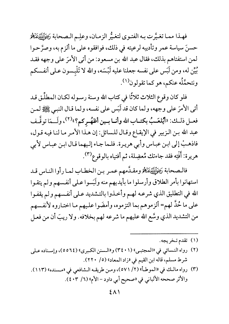 فهذا مما تغيَّرت به الفتوى لتغيُّر الزمان، وعلِم الصحابة - رضي الله عنهم - حسنَ سياسة عمر وتأديبه لرعيته في ذلك، فوافقوه على ما ألزم به، وصرَّحوا لمن استفتاهم بذلك، فقال عبد الله بن مسعود: من أتى الأمرَ على وجهه فقد بُيِّن له، ومن لَبَس على نفسه جعلنا عليه لَبْسَه، والله لا تَلْبِسون على أنفسكم ونتحمَّلُه عنكم، هو كما تقولون (¬١).