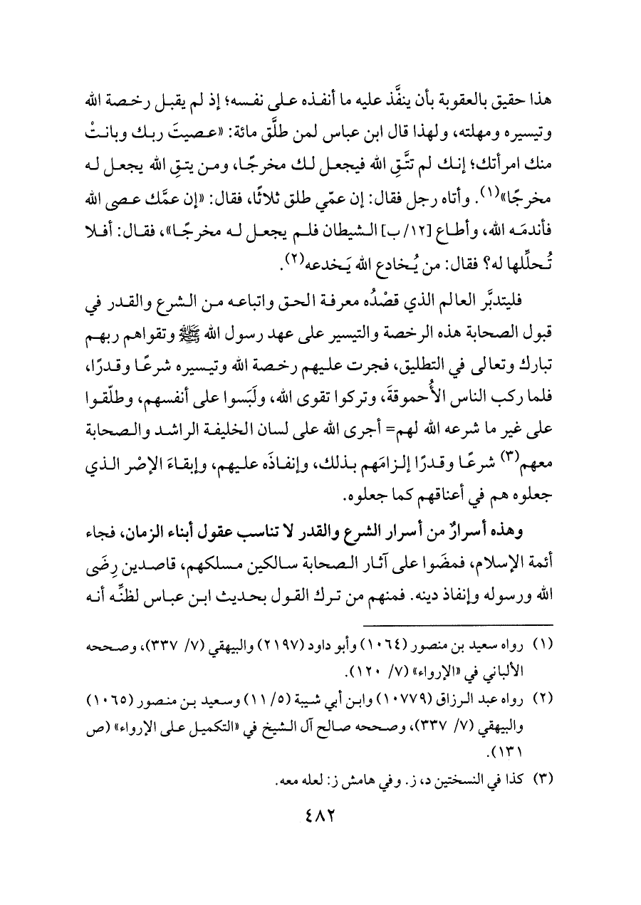 فليتدبَّر العالم الذي قصْدُه معرفة الحق واتباعه من الشرع والقدر في قبول الصحابة هذه الرخصة والتيسير على عهد رسول الله - صلى الله عليه وسلم - وتقواهم ربهم تبارك وتعالى في التطليق، فجرت عليهم رخصة الله وتيسيره شرعًا وقدرًا، فلما ركب الناس الأُحموقةَ، وتركوا تقوى الله، ولَبَسوا على أنفسهم، وطلّقوا على غير ما شرعه الله لهم= أجرى الله على لسان الخليفة الراشد والصحابة معهم (¬٣) شرعًا وقدرًا إلزامَهم بذلك، وإنفاذَه عليهم، وإبقاءَ الإصْر الذي جعلوه هم في أعناقهم كما جعلوه.