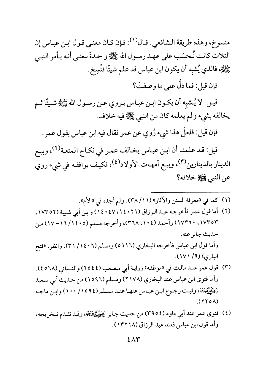 (¬٣) قول عمر عند مالك في «موطئه» رواية أبي مصعب (٢٥٤٤) والنسائي (٤٥٦٨). وأما فتوى ابن عباس عند البخاري (٢١٧٨) ومسلم (١٥٩٦) من حديث أبي سعيد - رضي الله عنه -، وثبت رجوع ابن عباس عنها عند مسلم (١٥٩٤/ ١٠٠) وابن ماجه (٢٢٥٨).