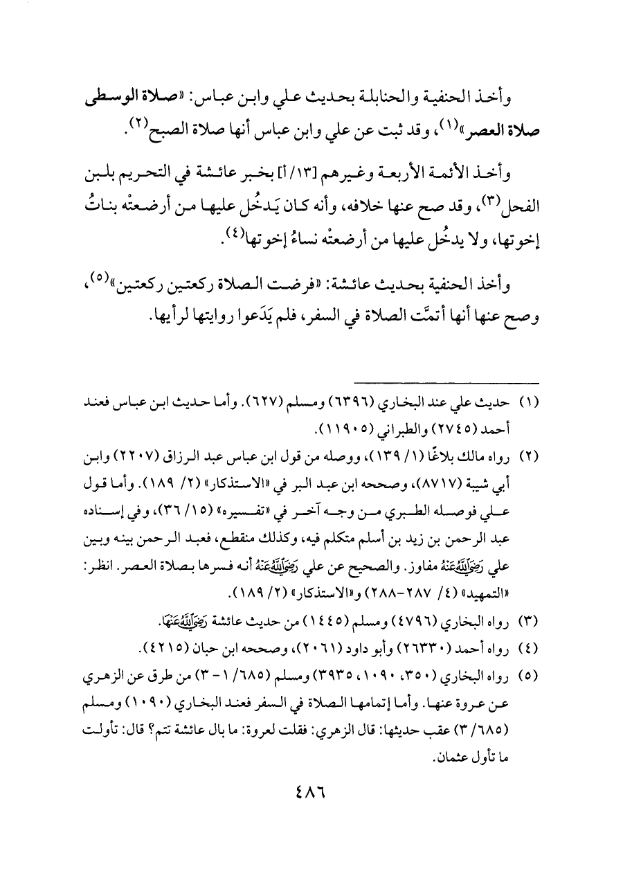 (¬٥) رواه البخاري (٣٥٠، ١٠٩٠، ٣٩٣٥) ومسلم (٦٨٥/ ١ - ٣) من طرق عن الزهري عن عروة عنها. وأما إتمامها الصلاة في السفر فعند البخاري (١٠٩٠) ومسلم (٦٨٥/ ٣) عقب حديثها: قال الزهري: فقلت لعروة: ما بال عائشة تتم؟ قال: تأولت ما تأول عثمان.