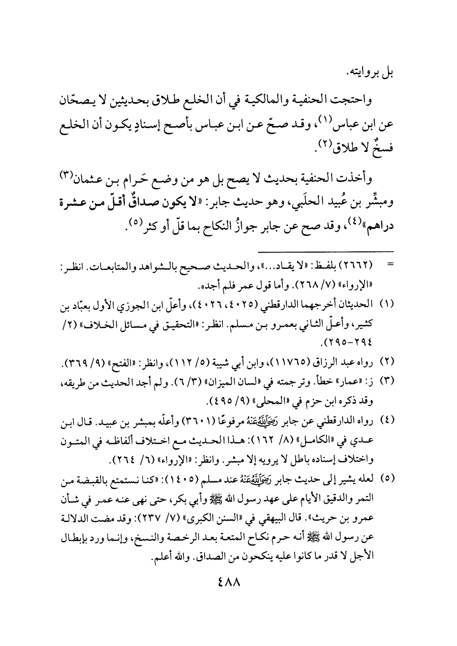 وأخذت الحنفية بحديث لا يصح بل هو من وضع حَرام بن عثمان (¬٣) ومبشِّر بن عُبيد الحلَبي، وهو حديث جابر: «لا يكون صداقٌ أقلّ من عشرة دراهم» (¬٤)، وقد صح عن جابر جوازُ النكاح بما قلّ أو كثر (¬٥).