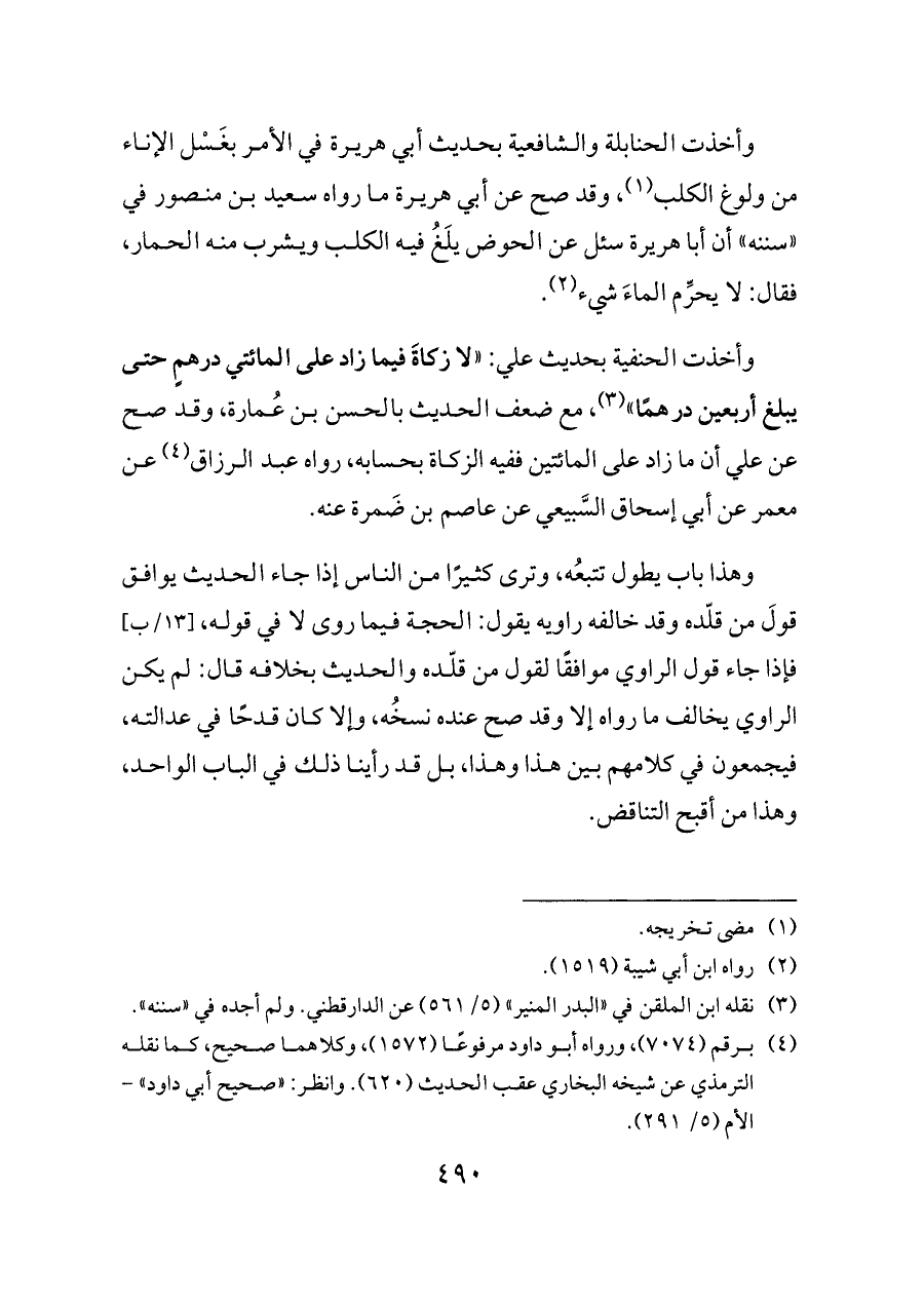 وأخذت الحنفية بحديث علي: «لا زكاةَ فيما زاد على المائتي درهمٍ حتى يبلغ أربعين درهمًا» (¬٣)، مع ضعف الحديث بالحسن بن عُمارة، وقد صح عن علي أن ما زاد على المائتين ففيه الزكاة بحسابه، رواه عبد الرزاق (¬٤) عن معمر عن أبي إسحاق السَّبيعي عن عاصم بن ضَمرة عنه.
